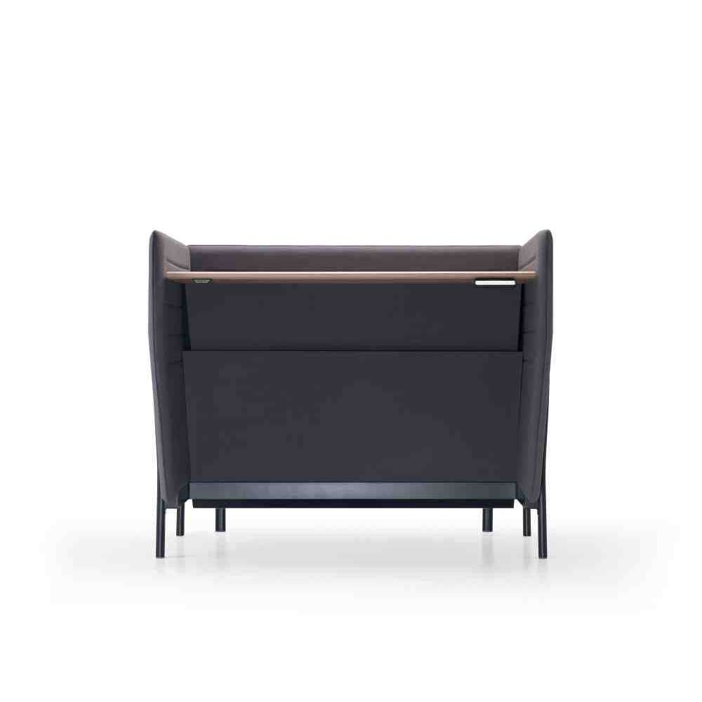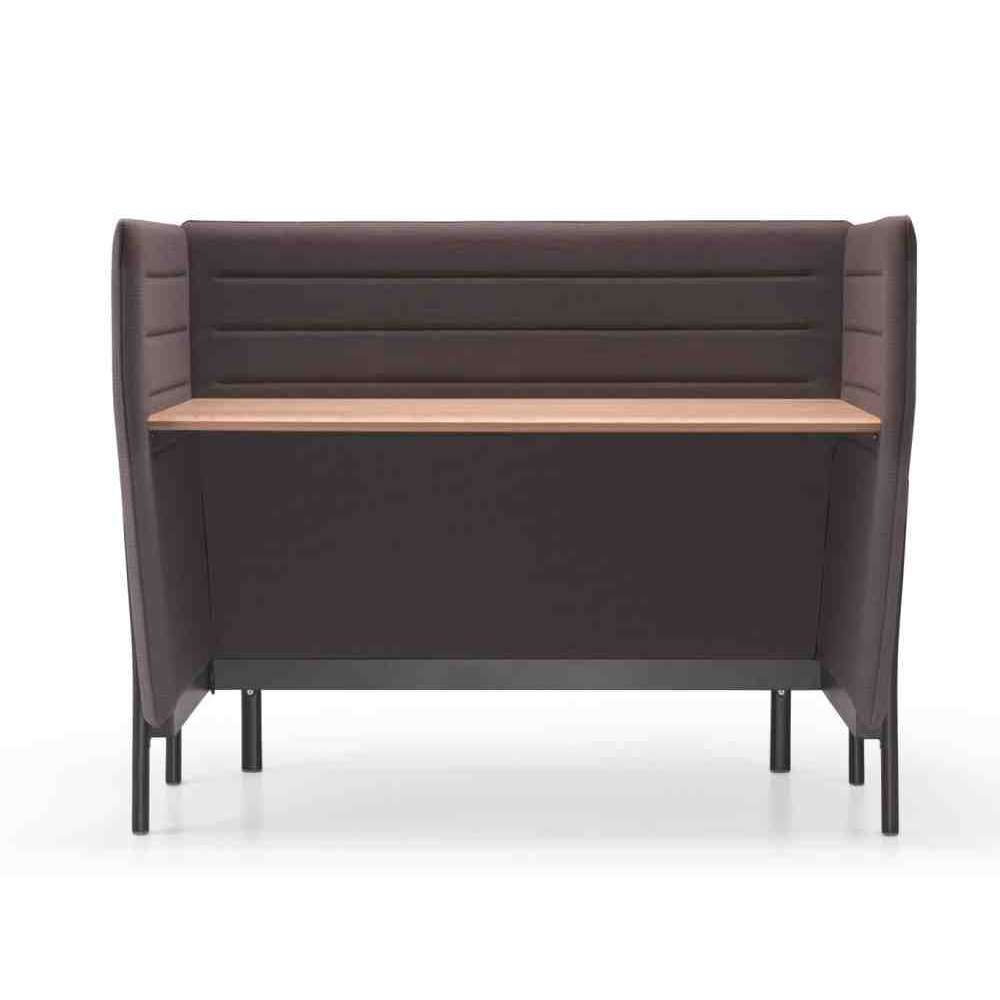 Nowe „biuro” porusza się i dostosowuje do różnych środowisk, oferując prywatność i komfort jedenastu sof z wysokim oparciem. Zakrzywiona konstrukcja drewniana podtrzymuje stały blat wykonany z fornirowanego lub malowanego MDF i wyposażony w zestaw do prowadzenia kabli do użytku z szeroką gamą urządzeń.