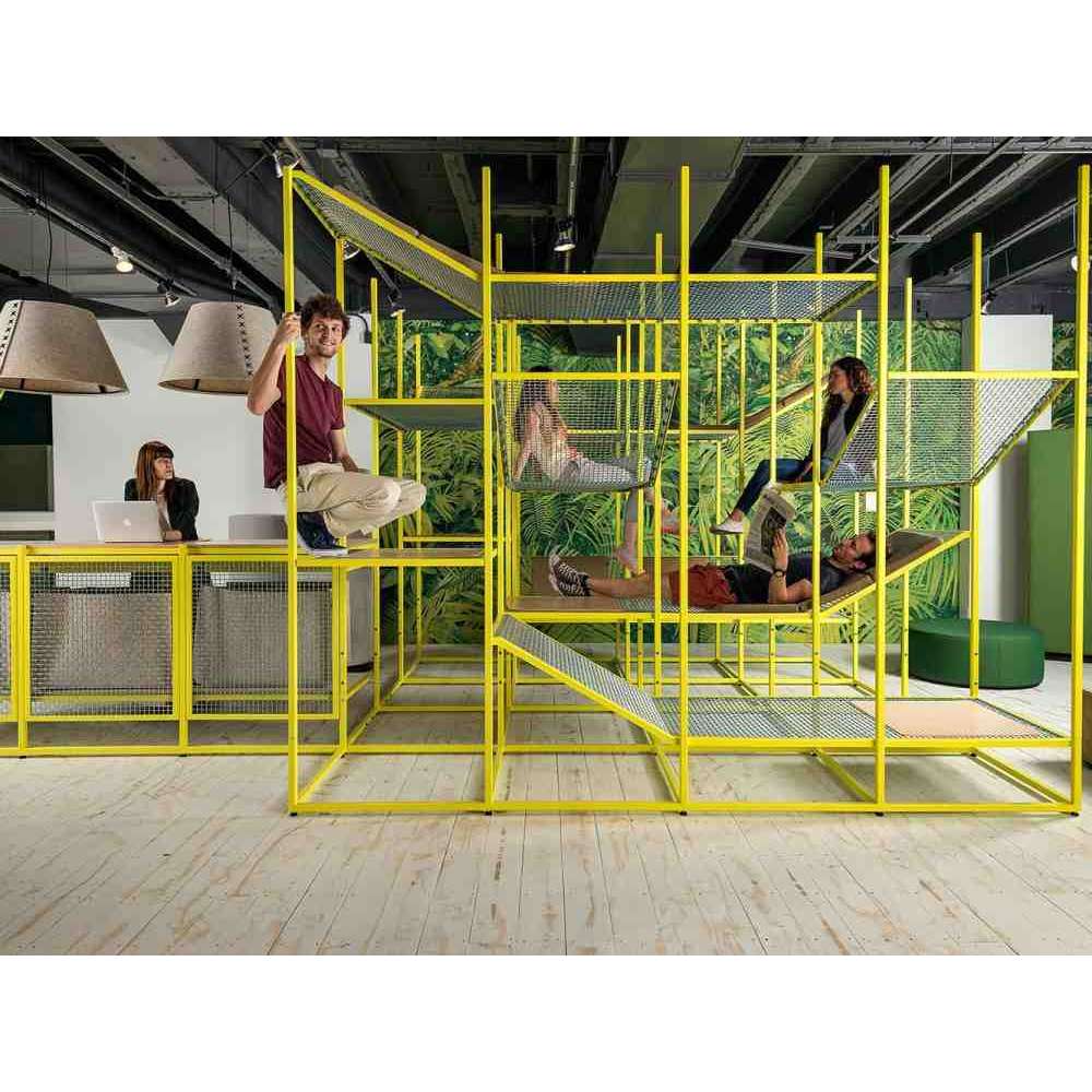 Różne elementy struktury dają możliwość różnych interakcji w „dżungli”. Możesz wspinać się, odpoczywać i spotykać w podwyższonej przestrzeni roboczej, wykonanej ze stali malowanej proszkowo. BuzziJungle tworzy miejski ślad w dużych i małych przestrzeniach.