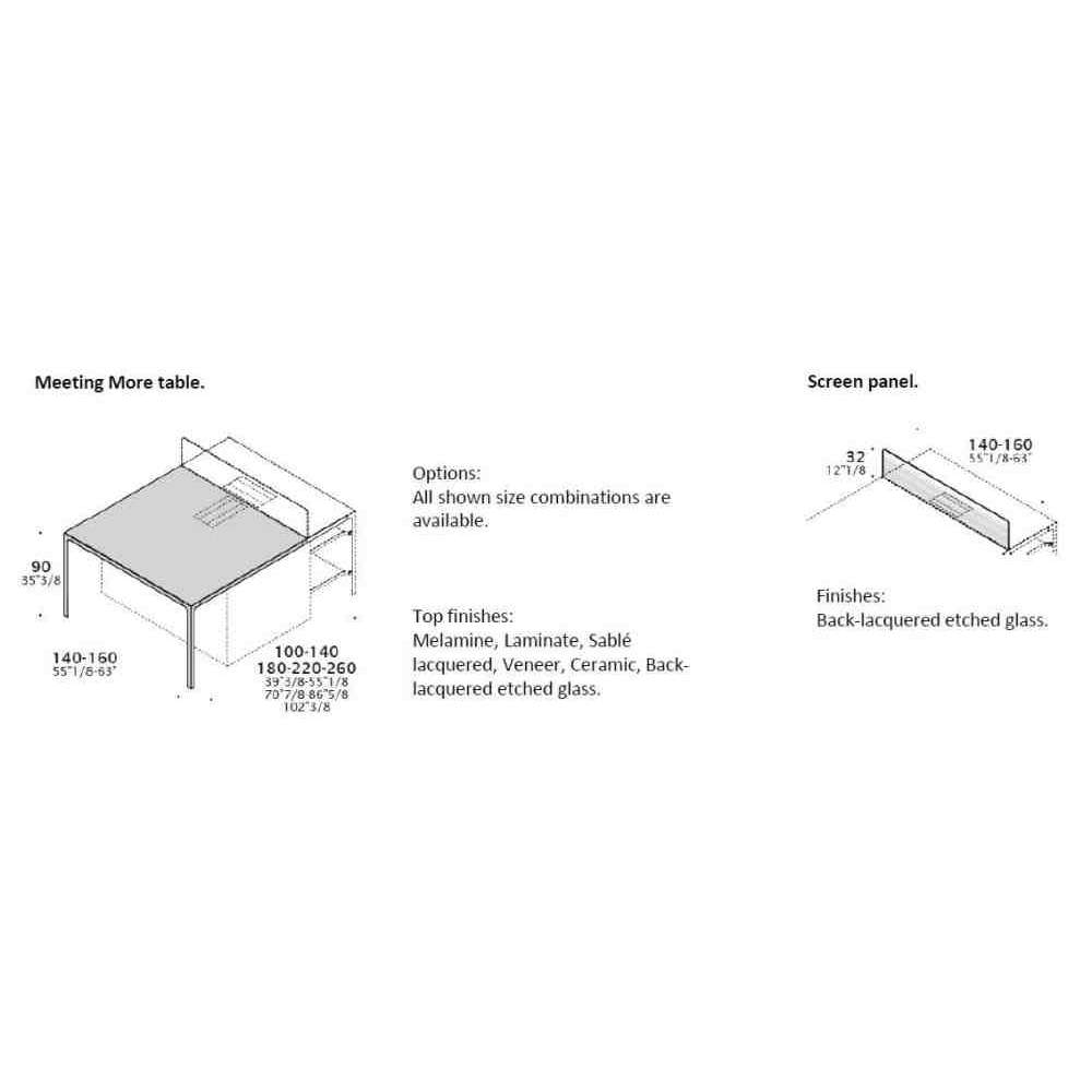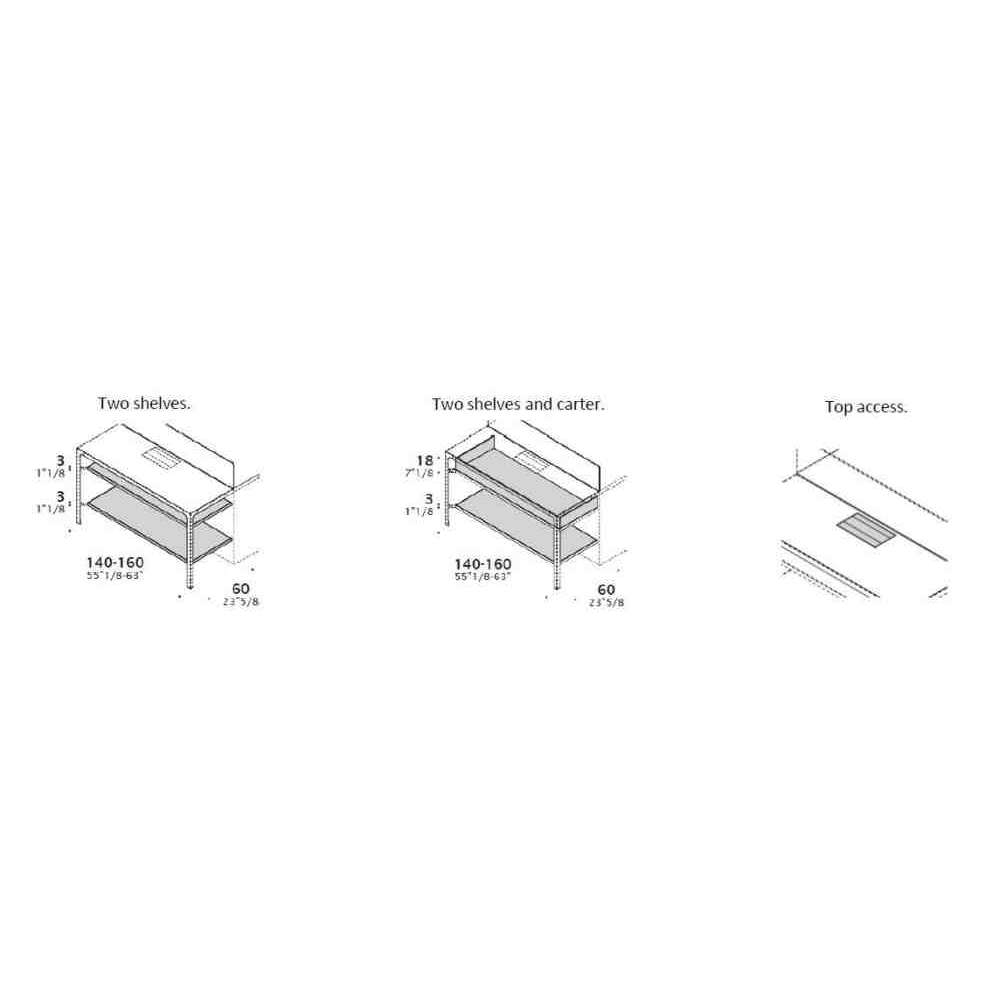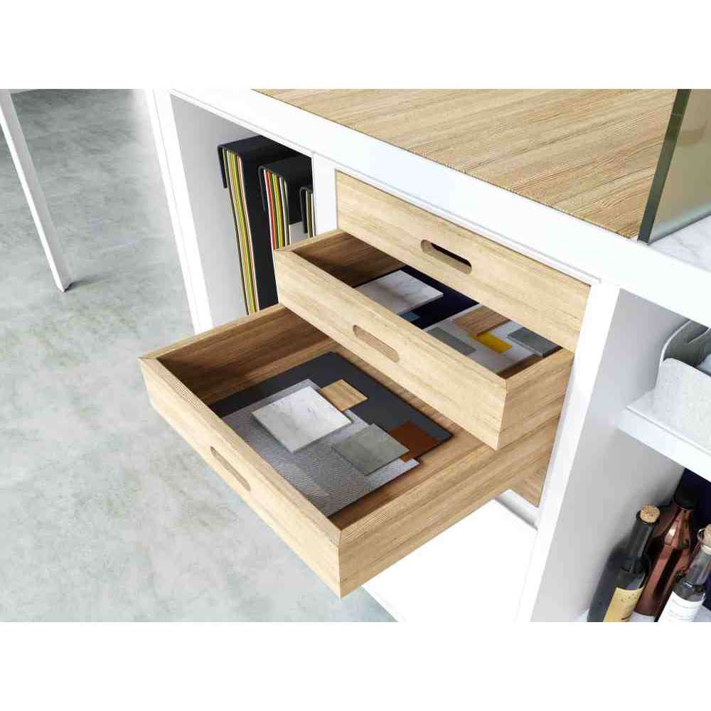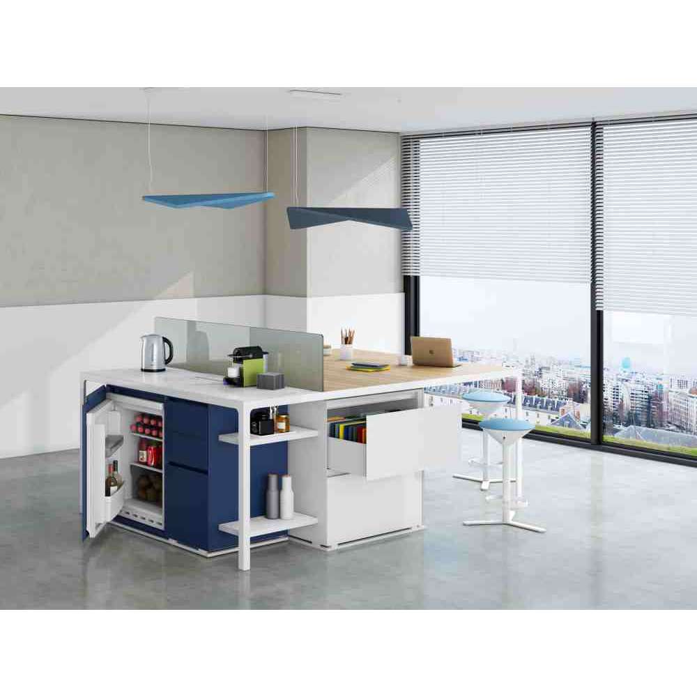 Przyjmuj ludzi, zabawiaj i ułatwiaj komunikację przy stole, gdzie wszystko jest łatwo dostępne: Isola Snack & Shop oferuje więcej funkcji zebranych w jedną kompozycję zbudowaną wokół dużego stołu Więcej H90xP140 / 160 cm. System jest przystosowany do obsługi różnych czynności, takich jak spotkania, lunch, przerwa na kawę lub przekąskę. Granice ze szkła trawionego wyznaczają granicę między tymi dwoma obszarami. W strefie technicznej można wstawić drobne urządzenia do kawy, dystrybutor wody, płyty do gotowania indukcyjnego