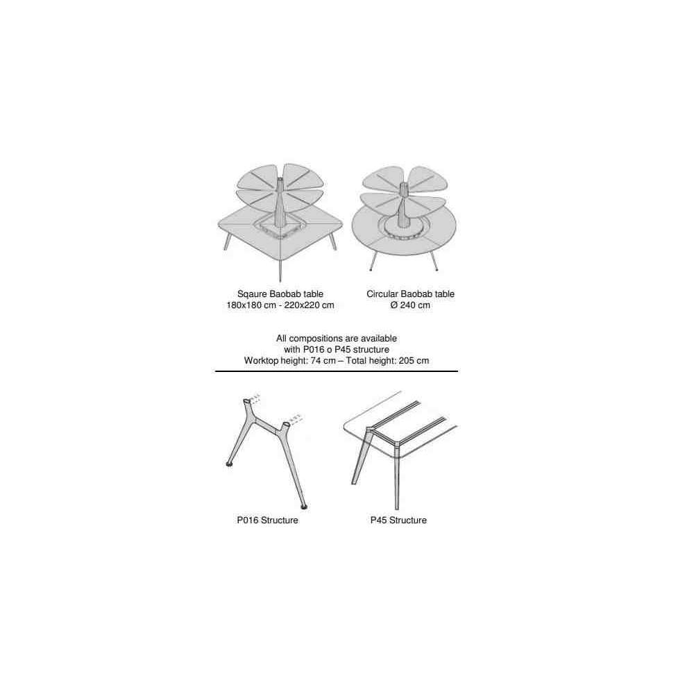 Prostokątny Baobab jest dostępny jako stół do spotkań lub ławka (w wersji bez centralnego stożka) lub jako stół do wspólnego użytku i recepcji (w wersji z centralnym stożkiem). metalowa konstrukcja dostępna w wykończeniu lakierowanym, chromowanym metalu (P016) lub w wersji z nogami z litego dębu (P45). Blat dostępny w wymiarach: 220x100 cm, 240x120 cm lub 300x150 cm. Dostępne są również przydatne uzupełniające, otwarte pudełko na akcesoria o wymiarach L30-60 x P30 cm x W15-33 cm (z funkcją uchwytu na kwiaty, schowka na rękawiczki, uchwytu na dokumenty).