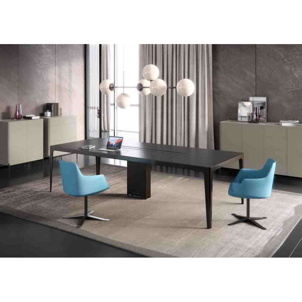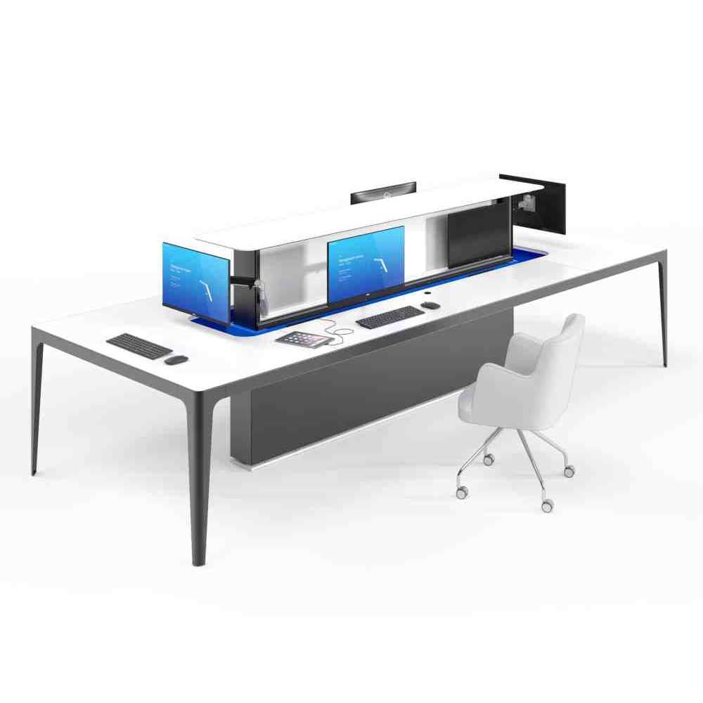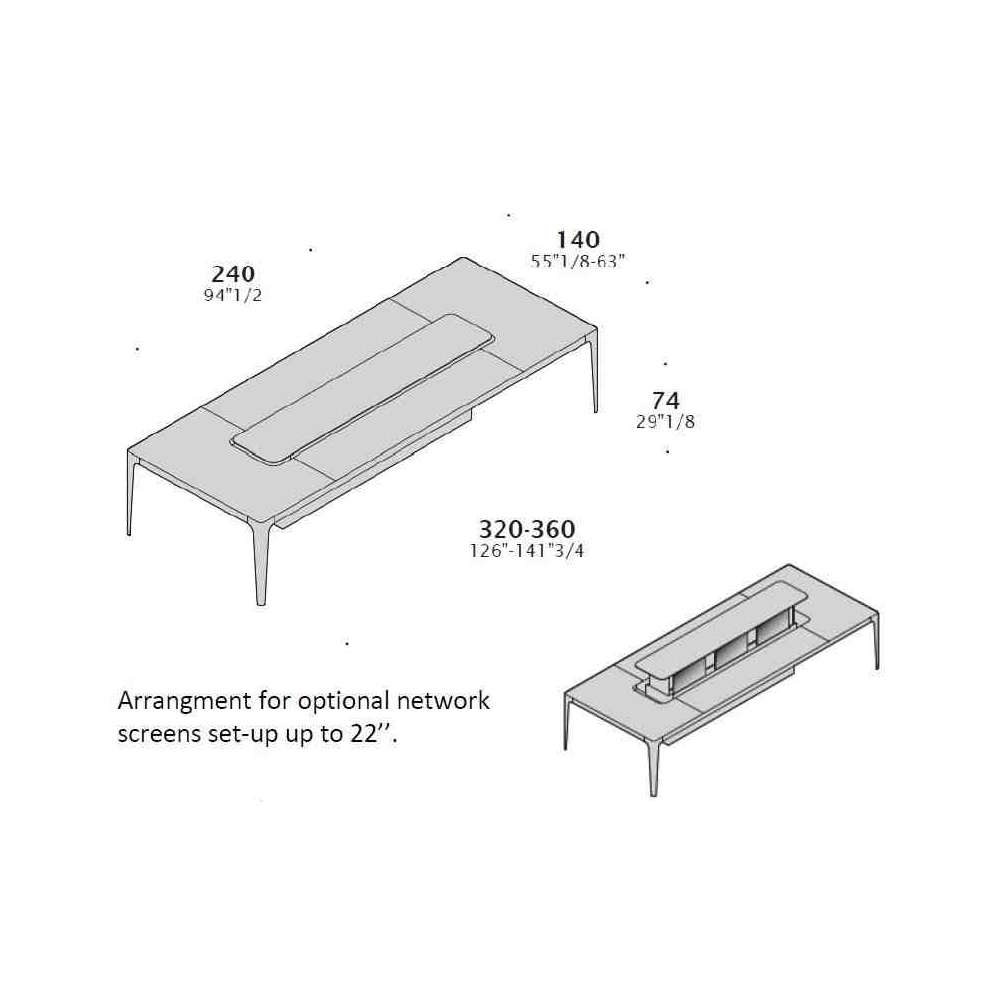 Stół konferencyjny Grand More Sharing, dzięki funkcjonalnemu panelowi windy, może szybko zamienić się w sześć osobistych stacji roboczych. Za pomocą jednego kliknięcia możesz podnieść centralny panel i aktywować sześć monitorów w sieci: ekrany są ergonomicznie regulowane i mogą być używane zarówno do pracy indywidualnej, jak i interaktywnych chwil w grupie roboczej.Grand More Sharing umożliwia łatwe podłączenie urządzeń mobilnych (smartfonów, tablety lub laptopy) do ekranów zamontowanych na panelu windy: pozwoli to pracować indywidualnie lub udostępniać zrzuty ekranu całemu zespołowi. Blat stołu Grand More Sharing o długości 360 cm pomieści do 8 osób podczas tradycyjnych sesji spotkań .Grand More Sharing jest również dostępny w wersji z panelem dźwiękoszczelnym: jednym kliknięciem możesz podnieść panel przegrody, izolując akustycznie dwie strony stołu.Po opuszczeniu panelu Grand More Sharing powraca do eleganckiego stołu do spotkań Podstawa panelu windy wyposażona jest w specjalny system elektryfikacji (media ładowania AC/Dc i USB).