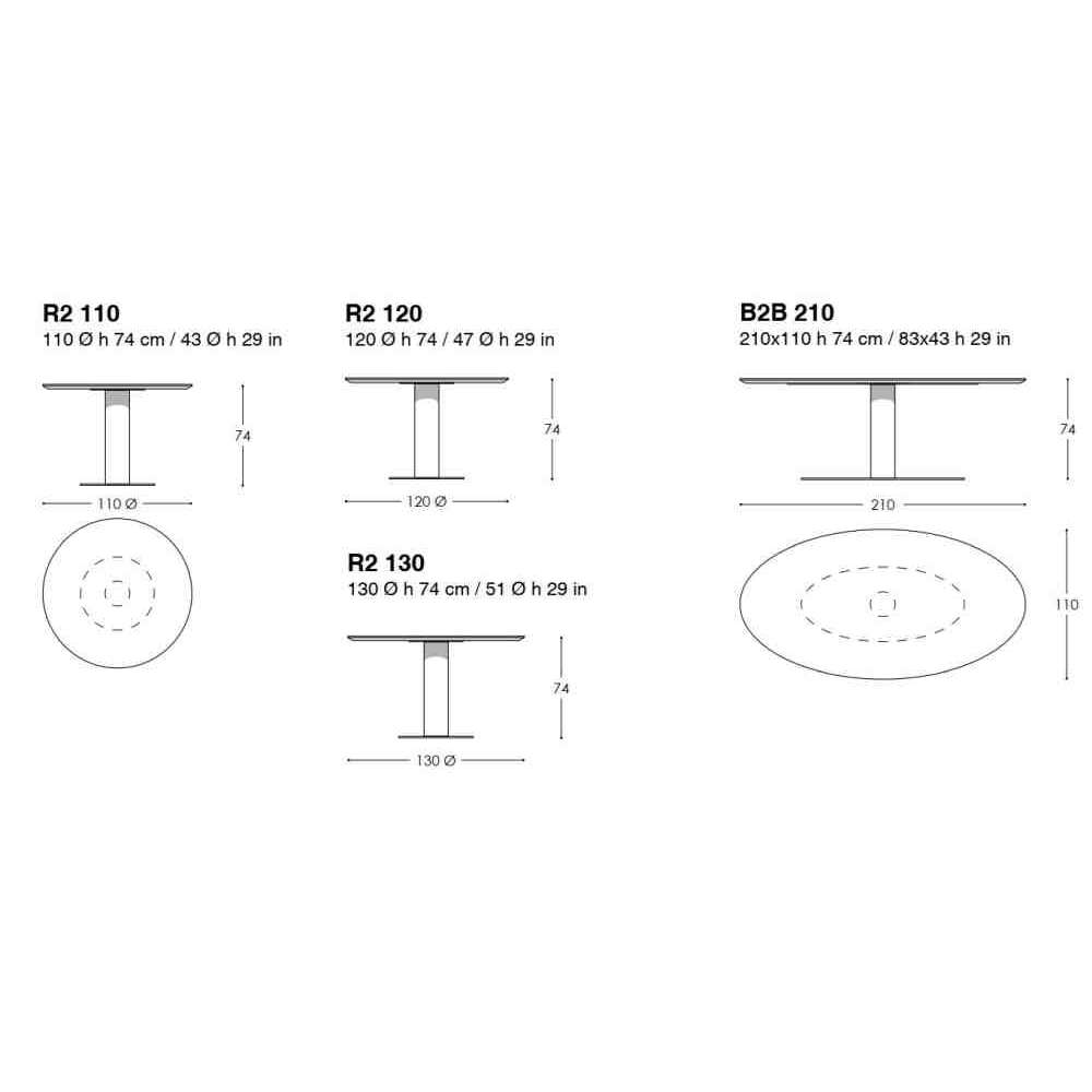B2B R2 stół konferencyjny z okrągłym lub owalnym blatem 30 mm, z prostą krawędzią 10 mm i ściętą pod kątem 45º krawędzią na dolnej powierzchni. Stopa składa się z jednej cylindrycznej metalowej kolumny przymocowanej do okrągłego wspornika z płyty.