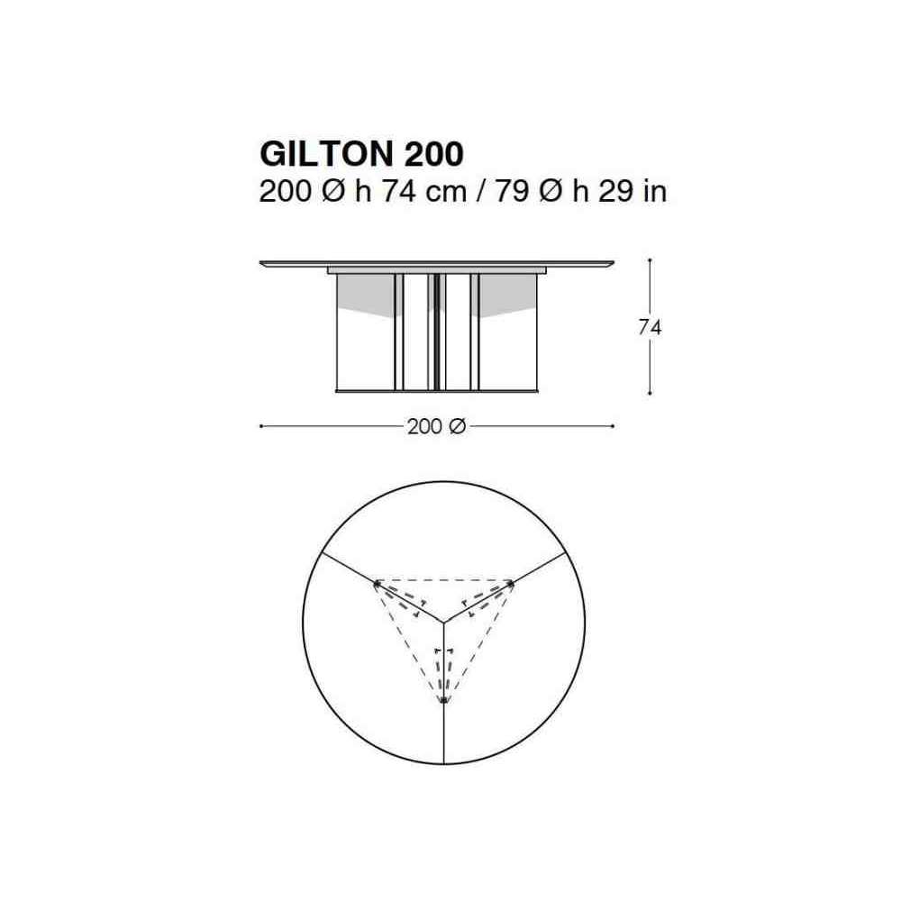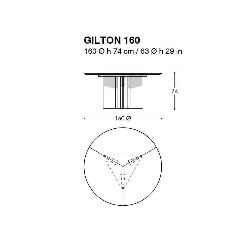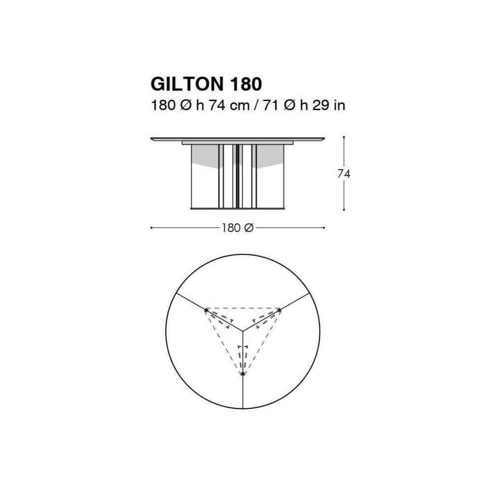 Stół do krycia GILTON z okrągłym blatem o grubości 30 mm z subtelną tapicerowaną tapicerką o grubości 4 mm ze skóry Techno podzielonej na 3 części i Edge z kątem prostym 10 mm i skosem 45º na dolnej powierzchni. Podstawa składa się z 3 trójkątnych, lakierowanych pryzmatów inkrustowanych stalą na końcach. Góra i nogi są przykręcone do trójkątnej aluminiowej podstawy.
