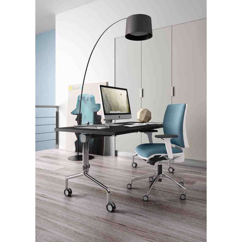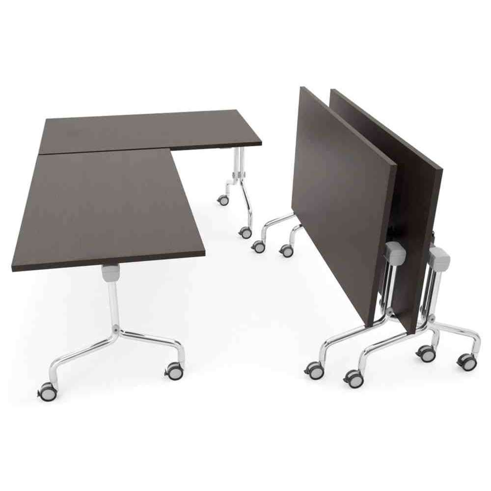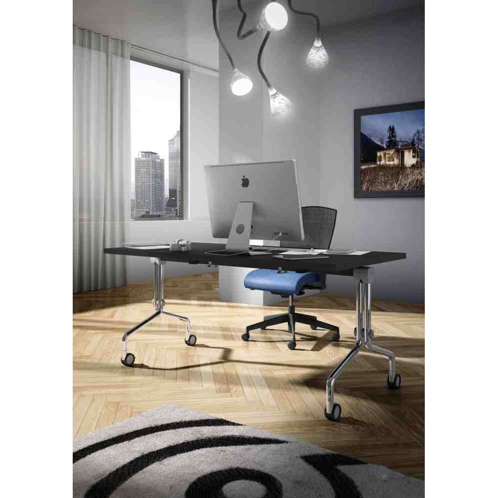 Czarna melamina z czarnymi krawędziami ABS. Mechanizm składania ze stali malowanej na czarno. Wspornik z czarnej stali. Blat składa się w pionie, co pozwala na poziome zagnieżdżenie stołu. Kółka z blokadą. Nogi ze stali chromowanej.