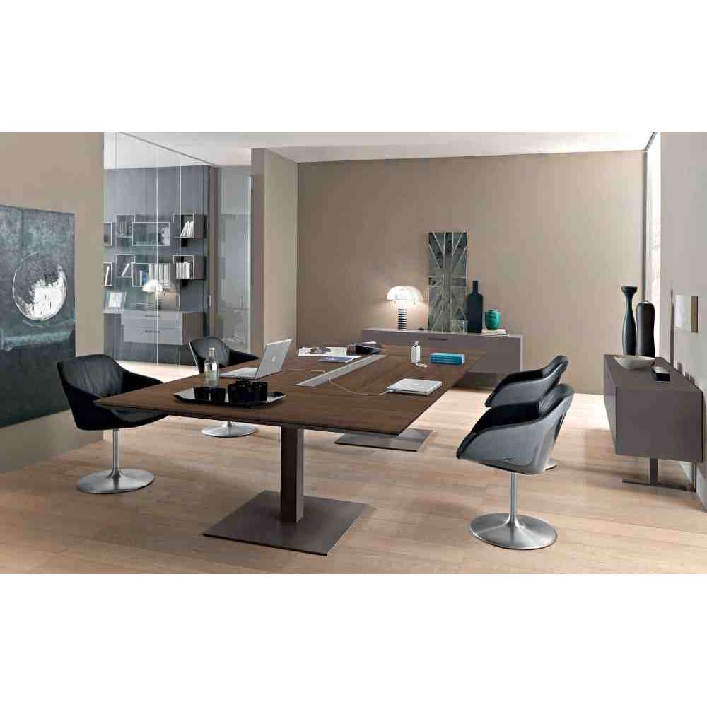 Stół jest również całkowicie okablowany dzięki centralnej klapie wyjścia kabla nad blatem oraz panelom wykończeniowym nóg słupa, które pozwalają ukryć prowadzenie przewodów.