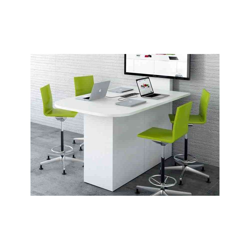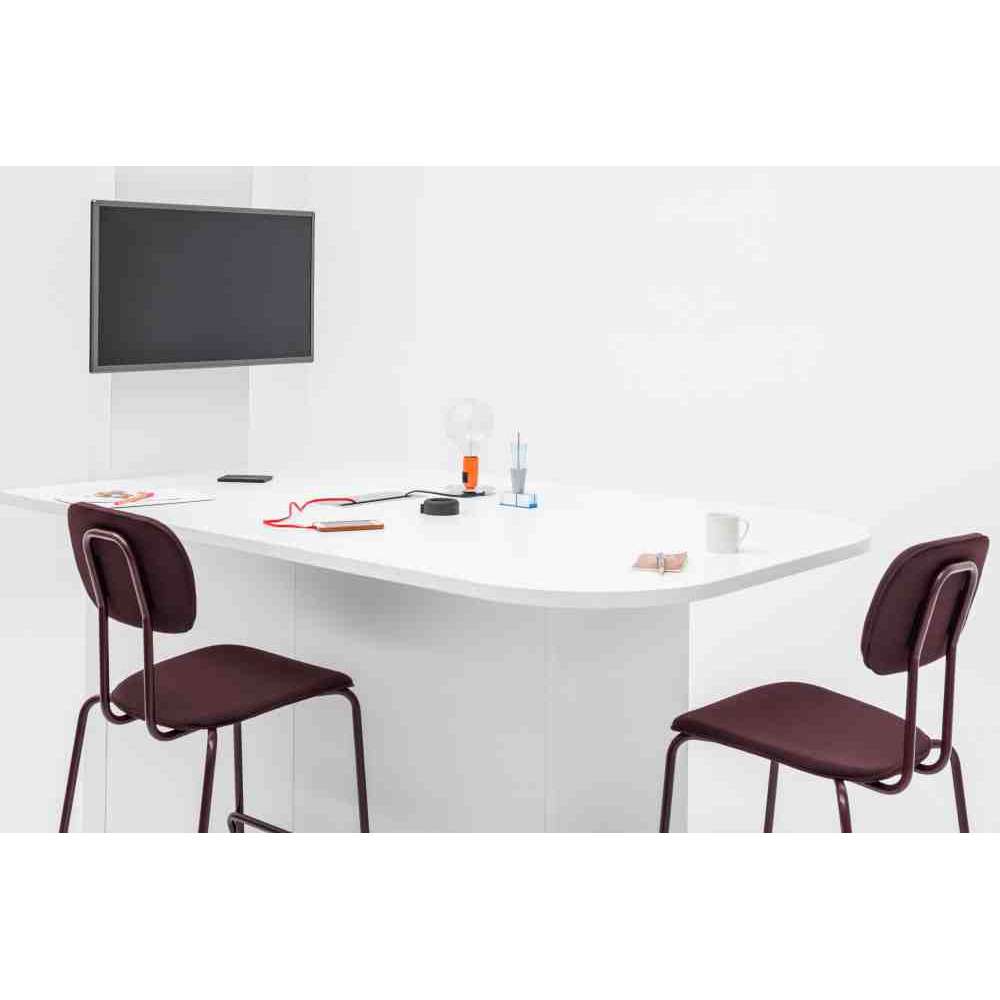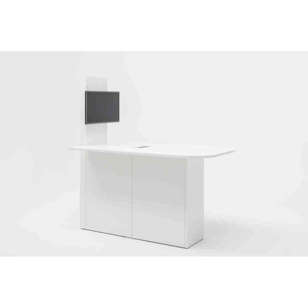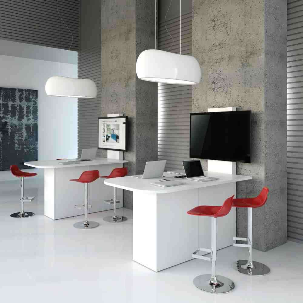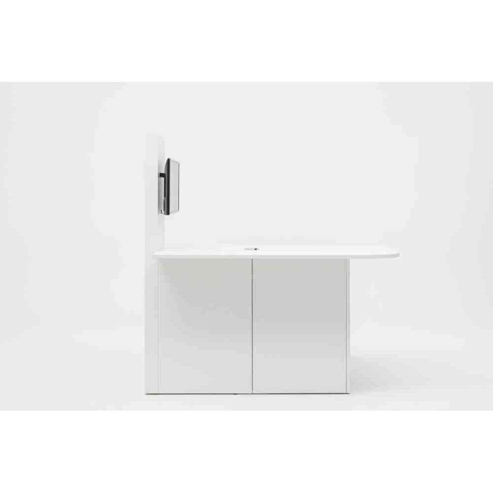 Prezentacje lub spotkania z wykorzystaniem materiałów cyfrowych – Stacja multimedialna to wygodna alternatywa dla klasycznej sali konferencyjnej wyposażonej w projektor. Sprawdza się w mniej przestronnych biurach lub open space’ach, gdzie trudno wyznaczyć osobną salę przeznaczoną wyłącznie na spotkania. Stacja multimedialna ułatwia prezentację materiałów cyfrowych. Podstawa stołu jest uważana za cenną zaletę, ponieważ zapewnia prawie niewidoczne miejsce do przechowywania dokumentów i sprzętu.