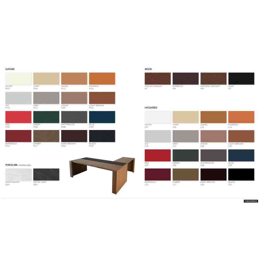 Freeport to stół konferencyjny dostarczany z dwoma drewnianymi kablami w górnej części wykonanymi z drewnianej klapki z zawiasami. Blat stołu wykonany jest z płyty MDF o grubości 40 mm 630 kg/m3 i naturalnego forniru z orzecha amerykańskiego. Z opcjonalną wstawką z naturalnej skóry licowej i 2 mm krawędzią z orzecha amerykańskiego.