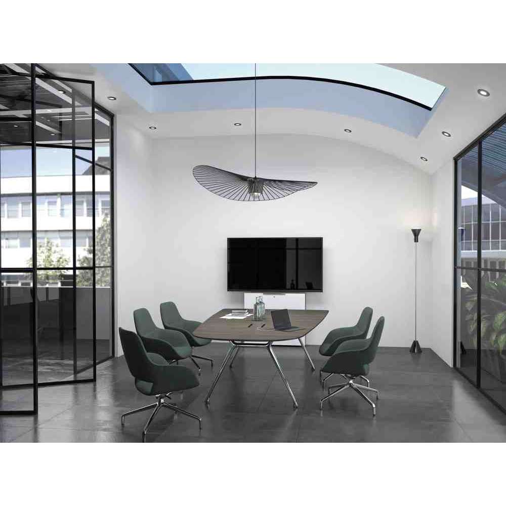 Detale uzupełniają szczególny charakter Convo: eleganckie aluminiowe ramy w kształcie litery A są dostępne w różnych rozmiarach i zapewniają solidną podstawę do przenoszenia każdego indywidualnego rozwiązania. Głębokość stołu Convo od 90 do 150 cm, a także różne kształty i powierzchnie blatu pozwalają mu elastycznie dostosowywać się do pomieszczeń i wymagań; skośna krawędź dodaje elegancji Convo. Opcjonalnie dostępne są obszerne kanały kablowe i panele dolne wykonane z filcu, które nie wymagają narzędzi do montażu. Niezależnie od tego, czy jest to pojedyncze biurko, przestronny stół w kształcie łódki, czy też otwarty lub zamknięty system konferencyjny – Convo pobudzi komunikację, gdziekolwiek się pojawi.