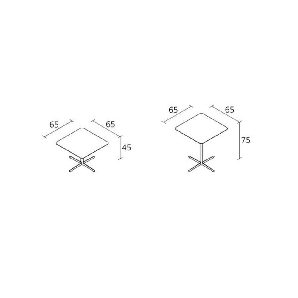 Kwadratowy stół z blatem z białego laminatu pełnokolorowego (grubość 12 mm) i podstawą ze stali lakierowanej piecowo lub chromowanej.