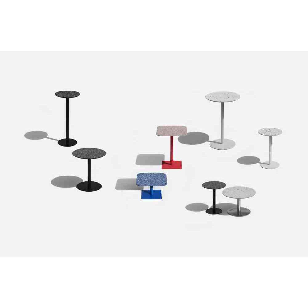 I to kolekcja stołów i małych stolików wykonanych z lastryko i stali powlekanej proszkowo.