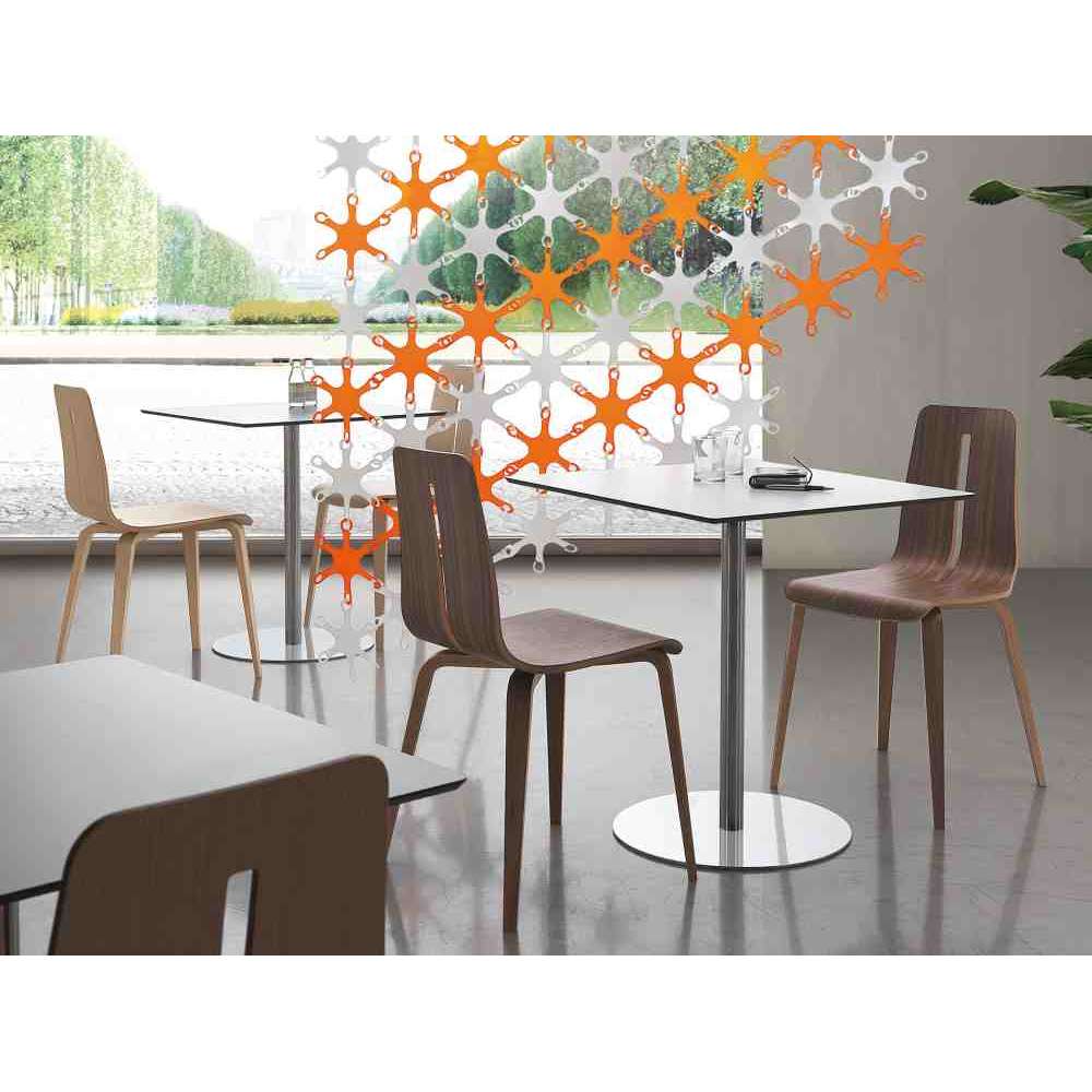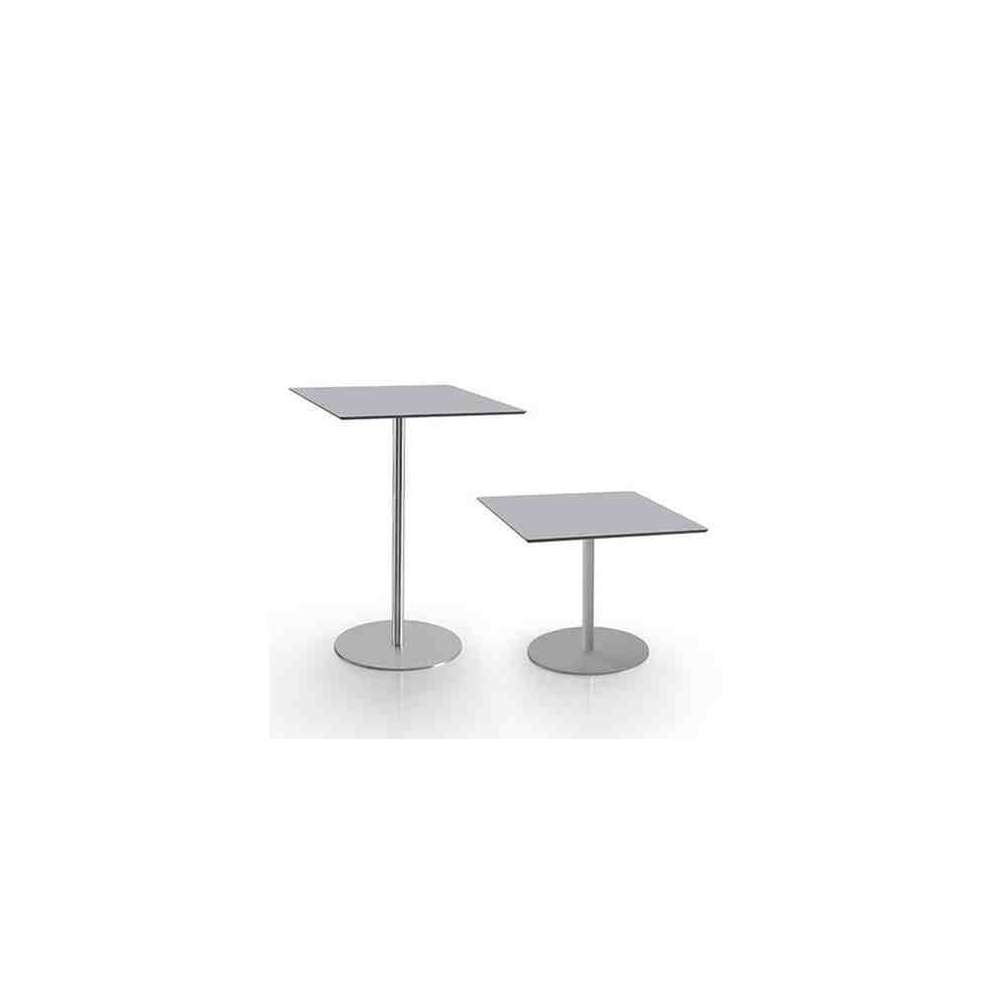 Małe stoliki z blatem dostępne zarówno z laminatu warstwowego HPL, jak i ze szkła hartowanego i szlifowanego o grubości 12 mm z przezroczystym lub satynowym wykończeniem. Stojak z chromowanej lub malowanej proszkowo stali epoksydowej. Podstawy wykonane ze stali malowanej proszkowo epoksydowo lub pokrytej stalą nierdzewną. Podstawy są specjalnie zaprojektowane do mocowania do podłoża. Blaty mocowane są do stojaka za pomocą specjalnych krążków ze stali nierdzewnej.