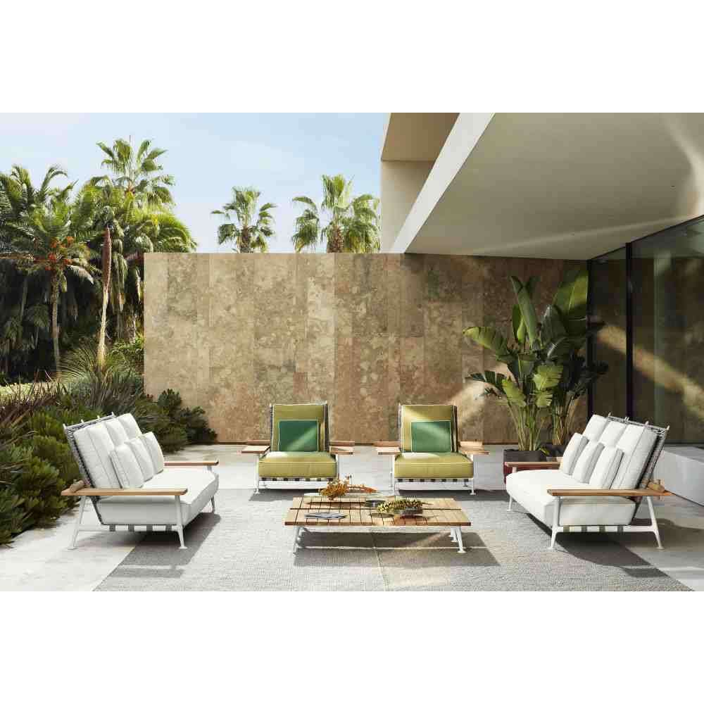 Stolik boczny Fence-e Nature, dostępny w jednym rozmiarze i dwóch różnych wysokościach, ma podstawę z organicznego odlewu aluminiowego, widoczną w siedziskach z kolekcji. Materiały są naturalne, najnowocześniejsze i najwyższej jakości. Blat z deskami wykonany jest z litego drewna tekowego z piaskowanym wykończeniem, co daje naturalny efekt.