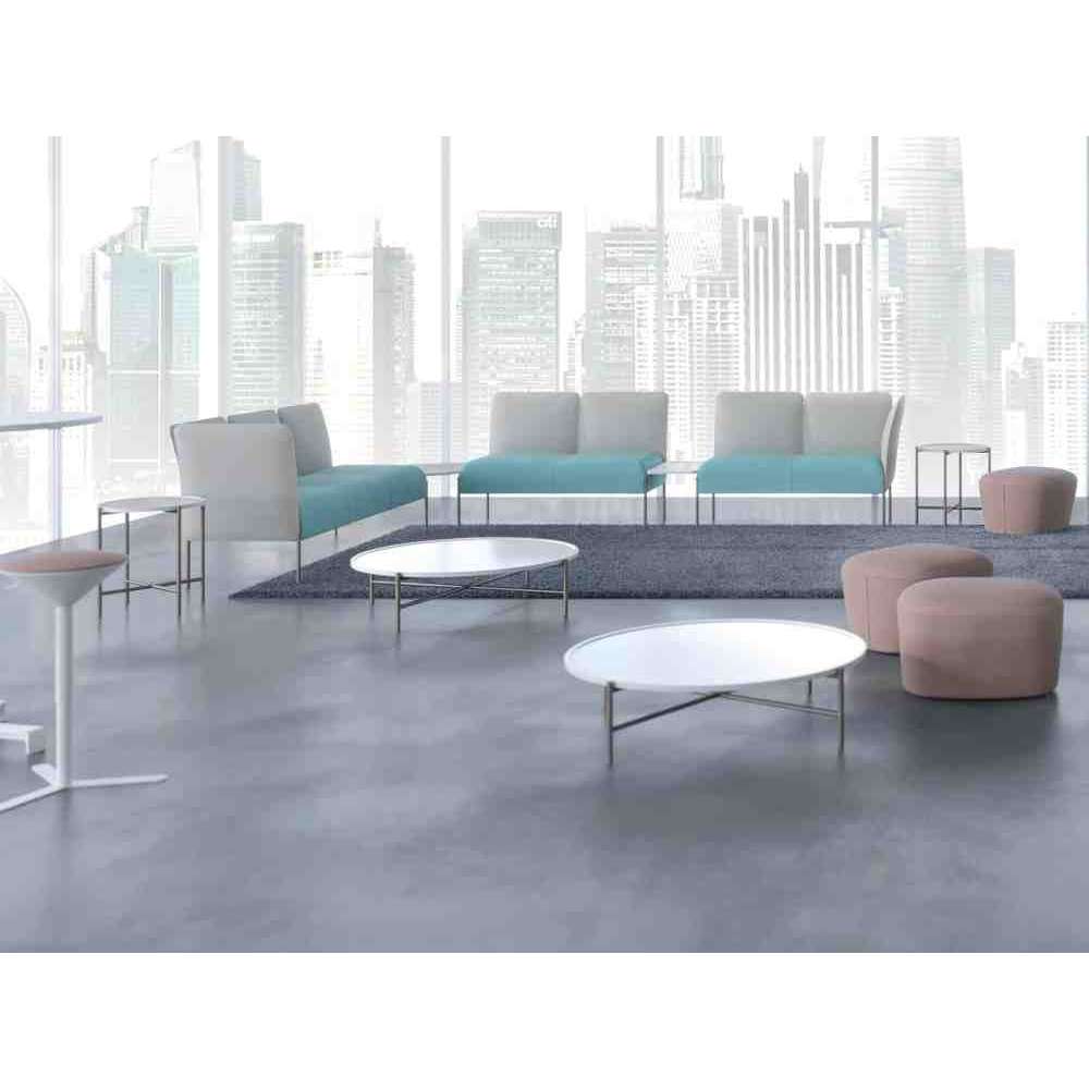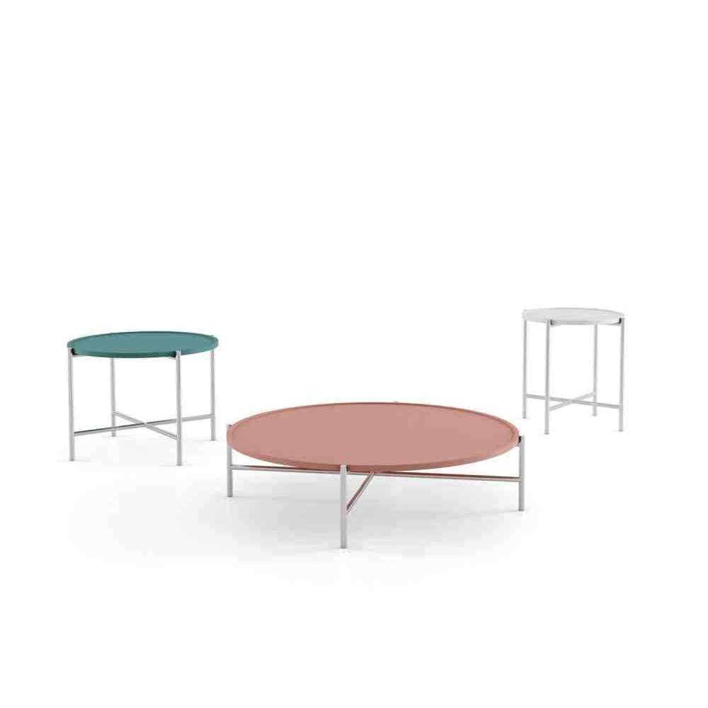 Wolnostojące stoliki kawowe Dolly, które uzupełniają rodzinę sof i ławek. Blat z lakierowanego mdf i chromowanej lub matowej konstrukcji malowanej proszkowo w kolorze White Snow.