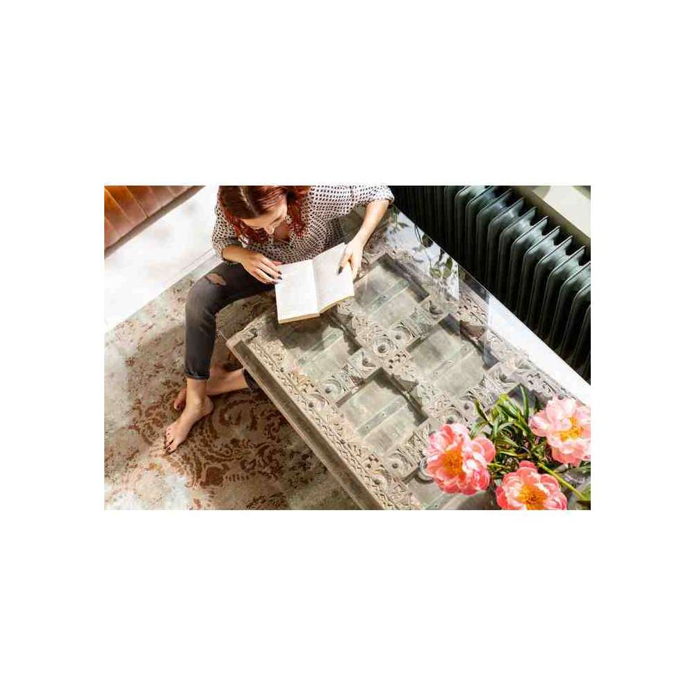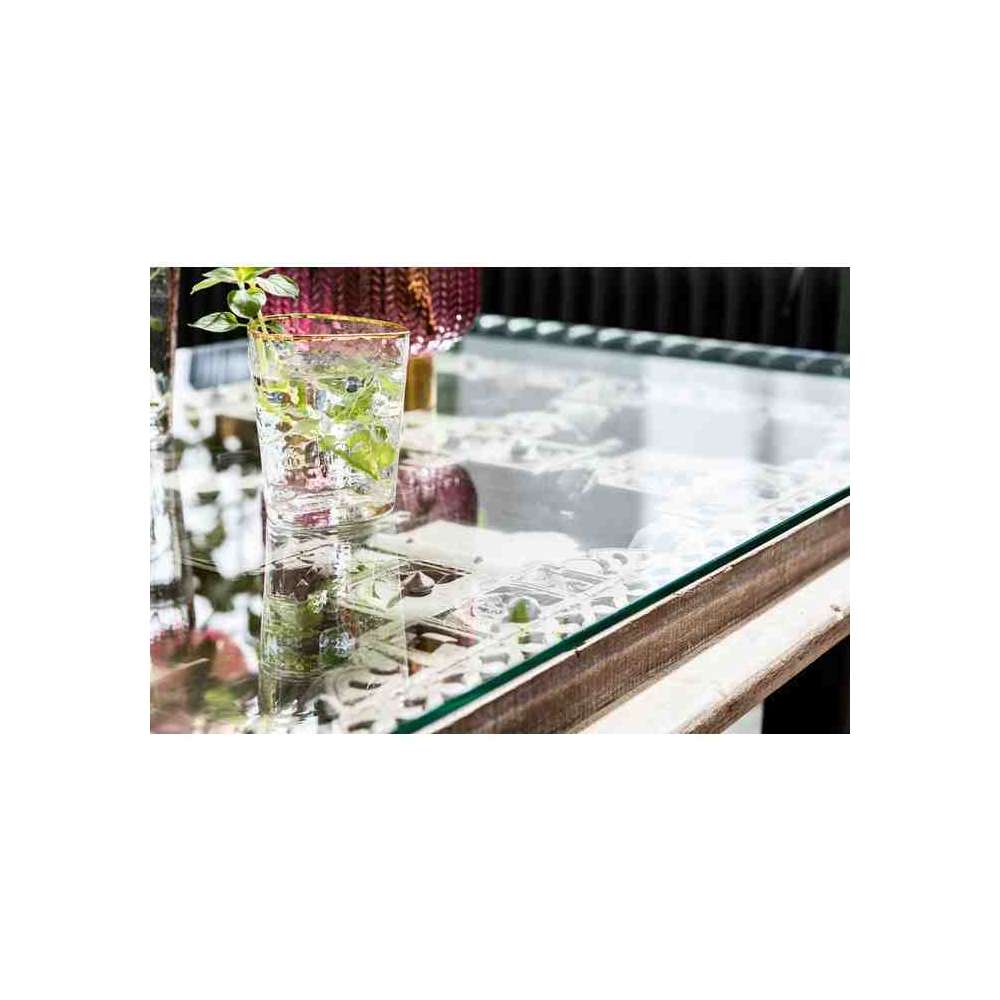 Pełen charakteru stolik kawowy, który umiejętnie łączy klasyczne detale z nowoczesnymi elementami. Pozornie unoszący się blat wykonany z bezpiecznego szkła (ESG) odsłania antyczne drzwi bogato zdobione intarsjami. Każdy egzemplarz jest niepowtarzalny. Seria: Kalif.