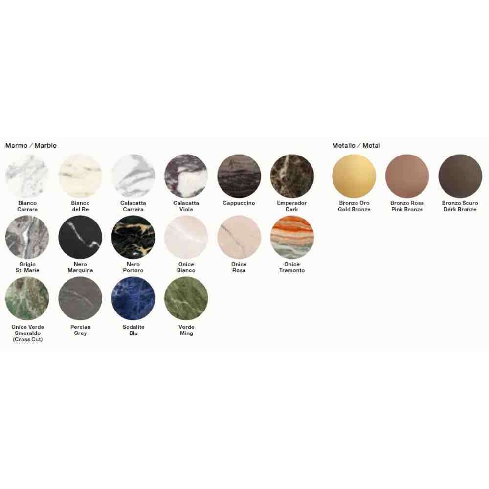 Kolekcja stolików kawowych Dora, zaprojektowana przez Enzo Berti dla Kreoo, składa się z trzech modeli. Każdy stół składa się z mosiężnej podstawy i blatu z marmuru lub kamienia półszlachetnego, różniących się wysokością, średnicą i proponowanym materiałem.