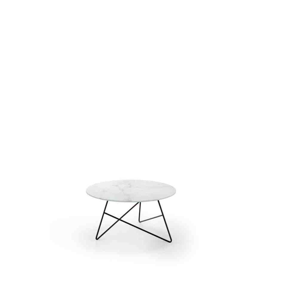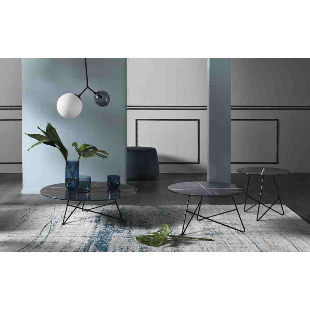 Stoliki kawowe Ermione są również dostępne do użytku w pomieszczeniach, a ich blat jest wykonany z wyjątkowo przezroczystego szkła, marmurowego szkła Calacatta i marmurowego szkła Sahara Black.