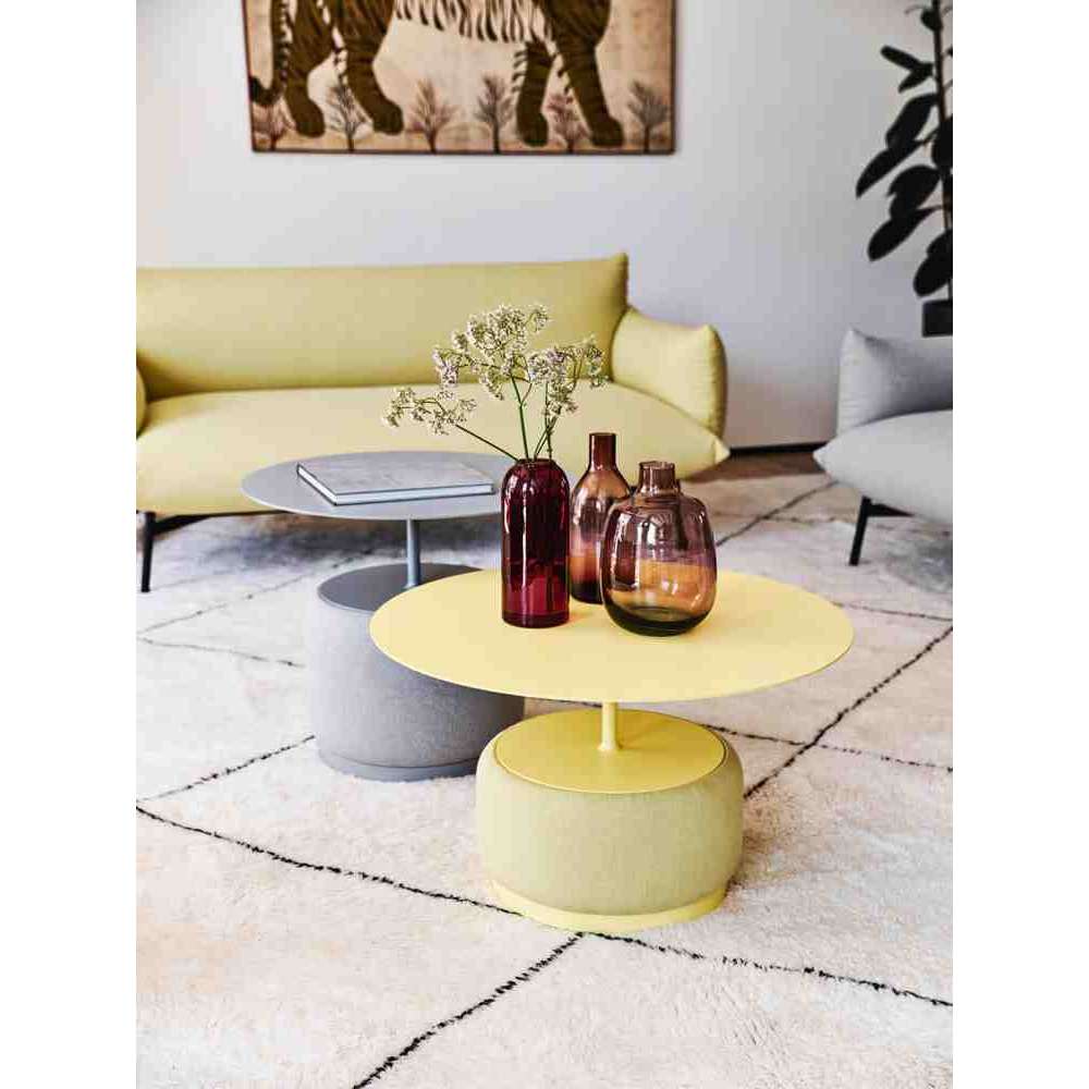 Stolik kawowy Bloom składa się z dwóch elementów: oryginalnej okrągłej podstawy obitej tkaniną, skórą lub ekoskórą o działaniu dźwiękochłonnym. Blat dostępny w wersji stalowej lub hpl.