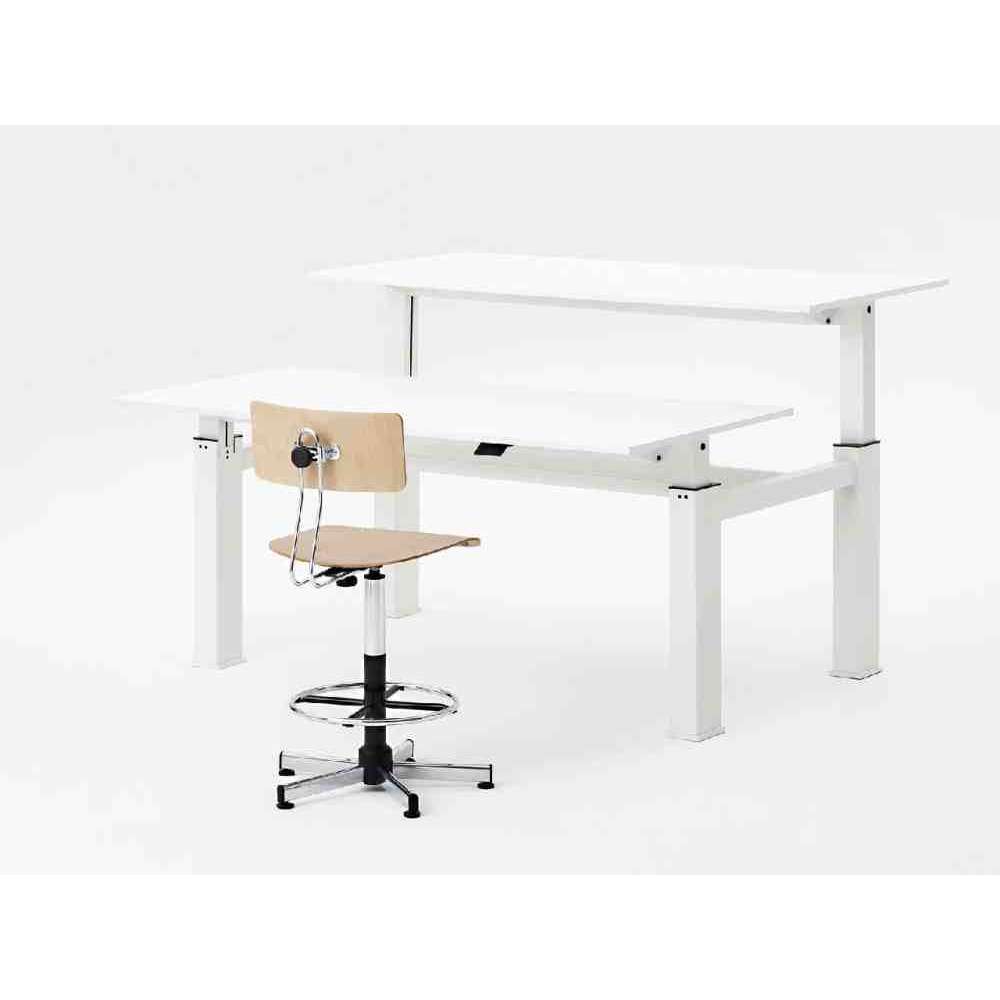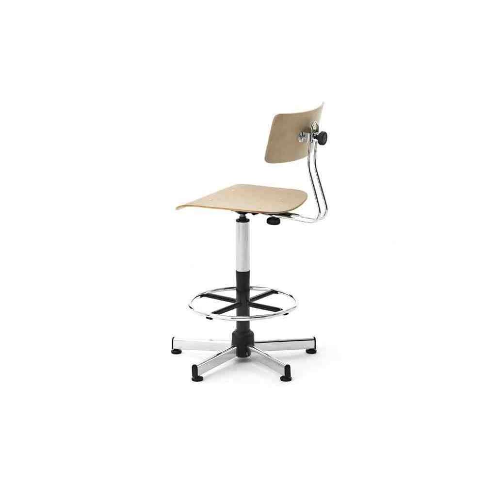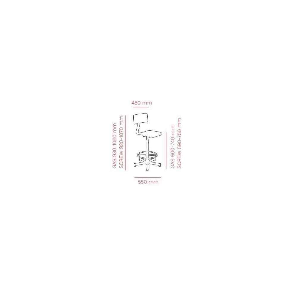 Taboret z regulacją wysokości, z gazem, składający się z solidnej i stabilnej konstrukcji stalowej. Dostępne w wersji siedziska i oparcia ze sklejki bukowej lub tapicerowane. Wersja z kółkami jest dostarczana bez podnóżka.