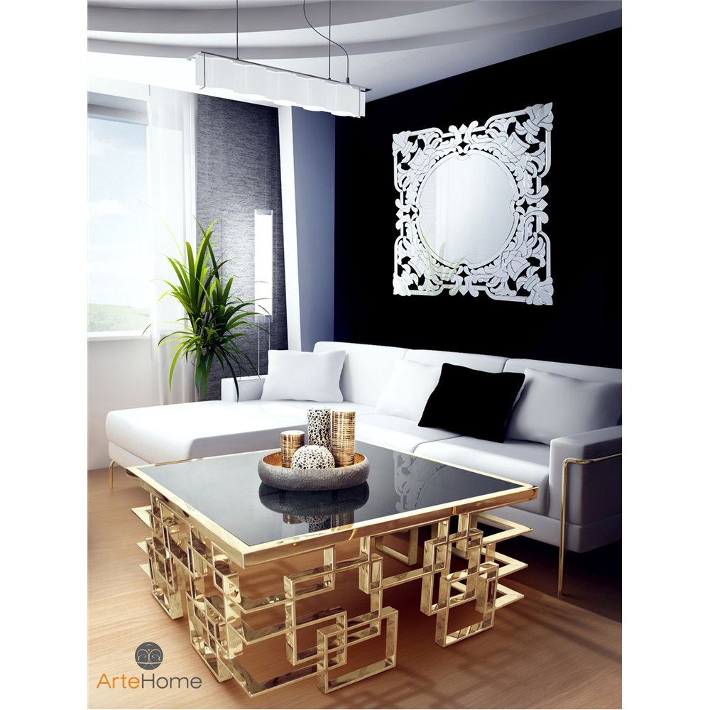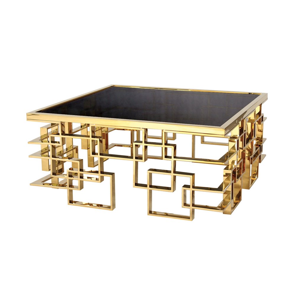 Cluso złoty stół kawowy ze szklanym czarnym blatem osadzony na oryginalnym stelażu 100/100/45 cm