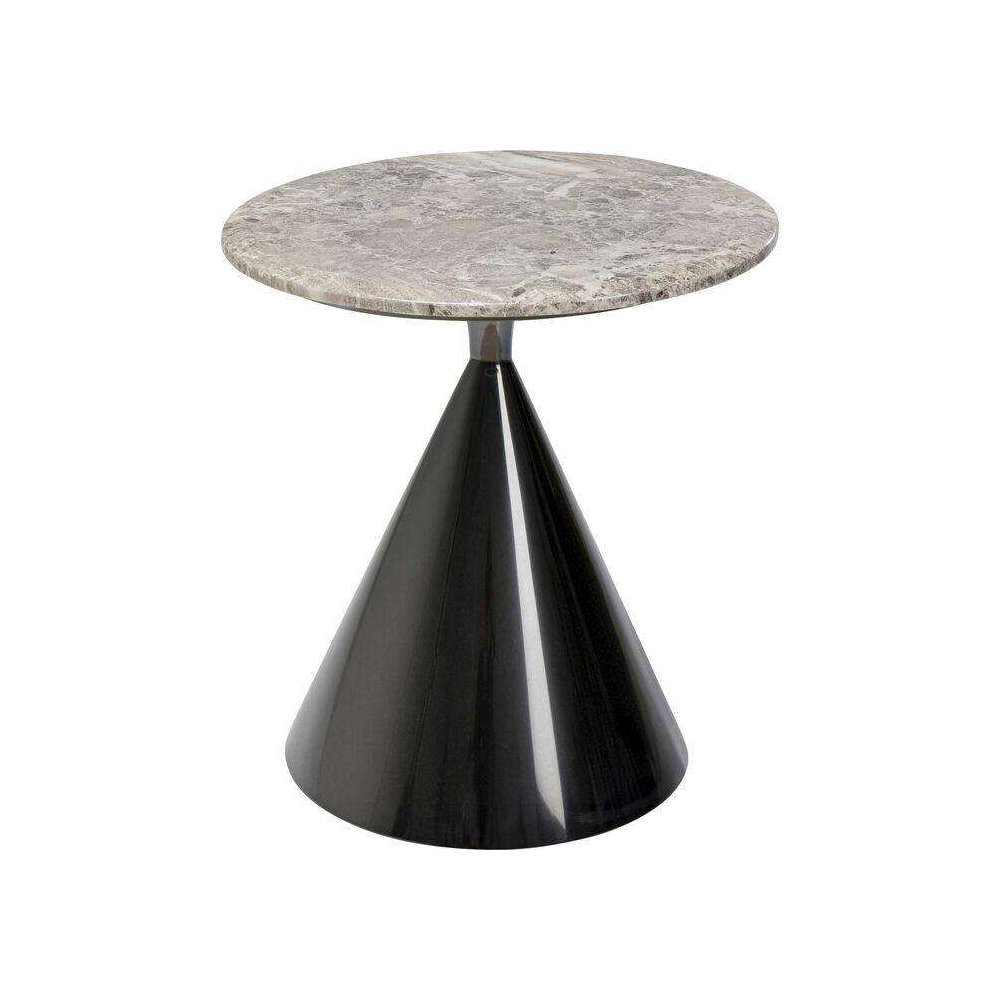 KARE stolik RITA 50 czarny. Nowoczesny, designerski stolik, który wyróżnia się unikalnym połączeniem eleganckiego wzornictwa i funkcjonalności. Okrągły blat został wykonany z marmuru syntetycznego, który nie tylko efektownie imituje kamień, ale także jest łatwy w pielęgnacji i odporny na uszkodzenia. Kolorystyka stołu łączy subtelny odcień szarości blatu z czarną, polerowaną podstawą w kształcie stożka, wykonaną z wysokiej jakości stali nierdzewnej. Kompaktowe wymiary stolika sprawiają, że doskonale nada się jako stolik nocny w sypialni, element dekoracyjny w salonie lub funkcjonalny mebel w przedpokoju. Maksymalna nośność wynosi 30 kg, co pozwala na bezpieczne przechowywanie ozdób czy drobnych przedmiotów codziennego użytku. Stolik Rita to idealny wybór dla osób ceniących sobie stylowe i trwałe rozwiązania w nowoczesnych wnętrzach. Wymiary: wys. 53 cm / szer. 50 cm / gł. 50 cm Blat: śr. 50 cm Waga brutto: 7,9 kg.