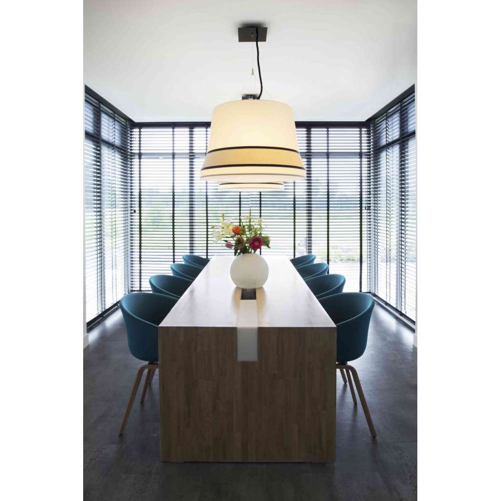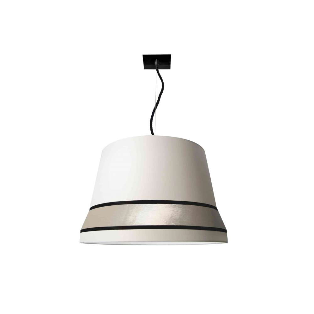 Audrey to lampa wisząca. Źródło światła: 3 X E27 żarówki LED Ikoniczny produkt inspirowany słynnym kapeluszem noszonym przez Audrey Hepburn w filmie „Śniadanie u Tiffany'ego”. Zaprojektowana z myślą o ekskluzywnych i eleganckich lokalizacjach, takich jak hole, butiki, kluby, restauracje, a także w eleganckich środowiskach mieszkalnych. Kolekcja Audrey , składająca się z dwóch wersji stołowych, wersji podłogowej i wiszącej, została zaprojektowana jako prawdziwa ćwiczenie stylu. Łączą się w sobie trzy odcienie: bawełna w górnej i dolnej części, bardzo cienka aksamitna opaska w części środkowej oraz dwie satynowe lamówki. Łodyga pokryta jest plecioną jedwabną liną.Odbiorca: :