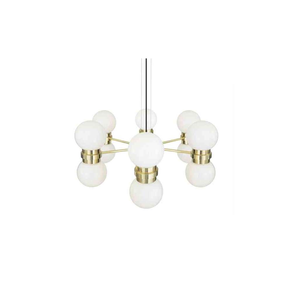 Żyrandol ESKE to imponująca oprawa oświetleniowa z sześcioma mosiężnymi ramionami, które wystają z cylindrycznego mosiężnego środka. Mosiężny środek żyrandola jest zawieszony na trzech stojakach z prawie niewidocznego drutu trakcyjnego i jest standardowo wyposażony w jeden metr czarnego kabla w oplocie (brązowy w wykończeniu z antycznego mosiądzu). Istnieje możliwość zamówienia dłuższych kabli. Na każdym ramieniu znajdują się dwa szklane klosze (łącznie 12), które są zamocowane w pozycji pionowej. Szklane klosze o średnicy 15 cm można zamówić w kolorze przezroczystym lub opalowym. Opalowe abażury pomagają miękko i równomiernie rozproszyć światło w całym zainstalowanym środowisku żyrandola, podczas gdy przezroczyste szkło maksymalizuje ilość światła emitowanego z tej niezwykłej oprawy.