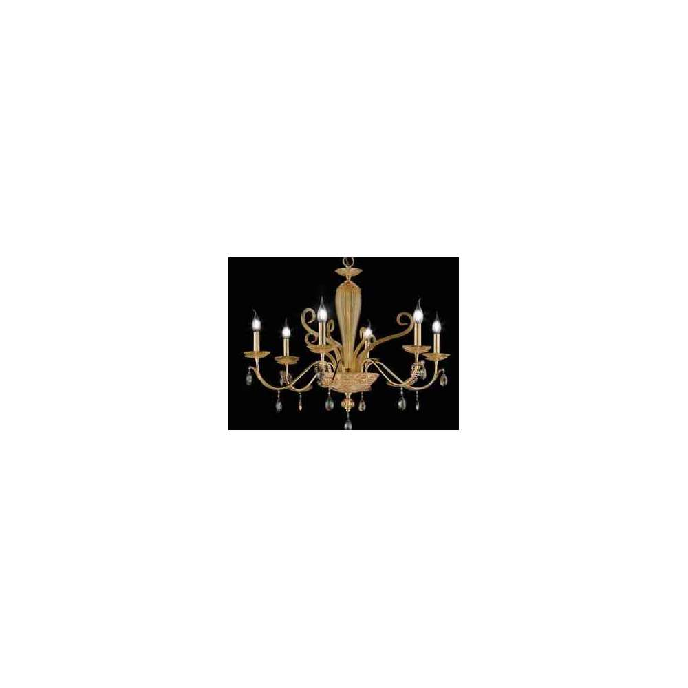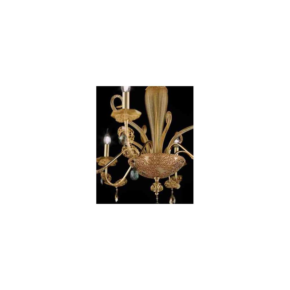 Szczegóły: centralny korpus z ręcznie dmuchanego szkła, wyprodukowany w Toskanii. Francuskie loki wyprodukowane w Wenecji. Ramiona i elementy ozdobne z metalowego filigranu oraz ze srebrnymi spawami są wykonywane ręcznie według naszego rysunku. Ozdobiony zawieszkami Swarovski®. Odcień 34/72 mod. wysoki stożek ze złotą skórą i brązową organzą. Inne abażury na zamówienie.