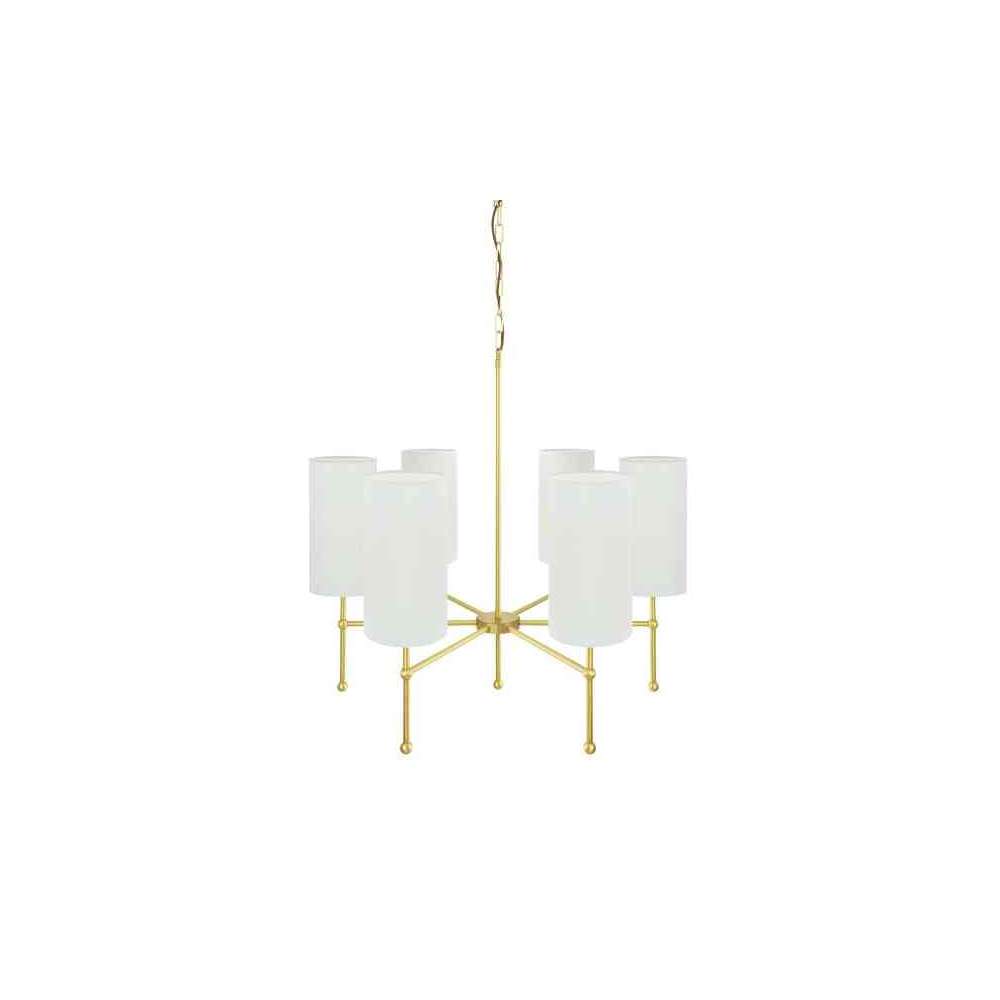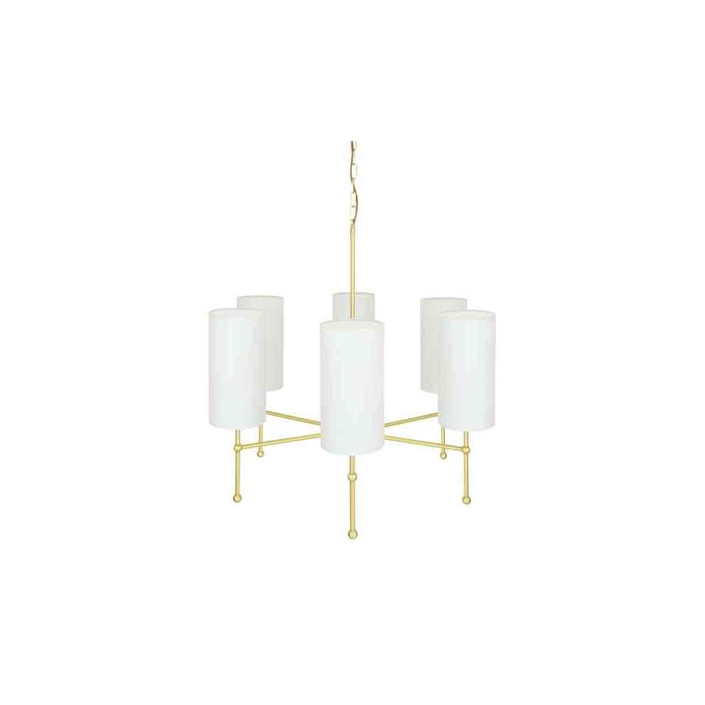 Żyrandol ARIZONA to nowoczesny żyrandol z sześcioma ramionami, z których każdy posiada wysokie, wąskie abażury z tkaniny. Centralna mosiężna rura zawiera mosiężny cylindryczny środek z sześcioma wystającymi poziomo ramionami. Na końcu każdego ramienia mosiężna rurka rozciąga się pionowo nad i pod mosiężnym przegubem kulowym i utrzymuje na miejscu wysoki, wąski klosz z białej tkaniny. Każde ramię posiada oprawkę E27 pasującą do naszych żarówek LED Edison (sprzedawanych osobno).