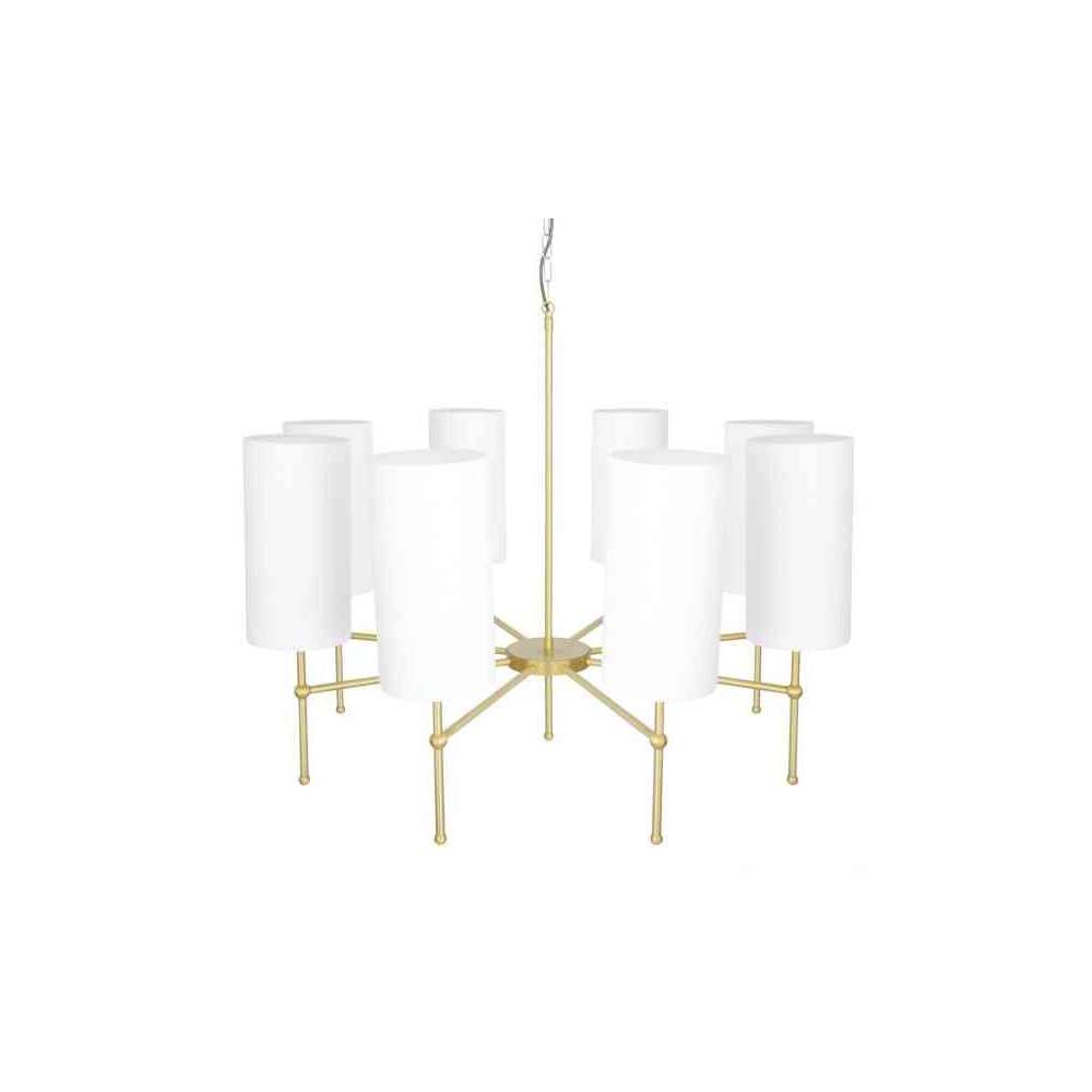 Żyrandol ARIZONA 8 ARM ma osiem mosiężnych tulei, które wywodzą się z mosiężnego cylindrycznego środka. Każda tuleja wystaje poziomo przed spotkaniem z mosiężnym przegubem kulowym. Osiem kolejnych mosiężnych tulei przechodzi pionowo przez każdy przegub kulowy. Każdy pionowy rękaw zawiera mosiężny uchwyt lampy i wysoki, wąski klosz z tkaniny. Kolejna mosiężna tuleja jest przymocowana do centralnego korpusu współczesnego żyrandola Arizona. Ten rękaw jest zawieszony na dostarczonej rozetce sufitowej za pomocą pasującego łańcucha oświetleniowego.