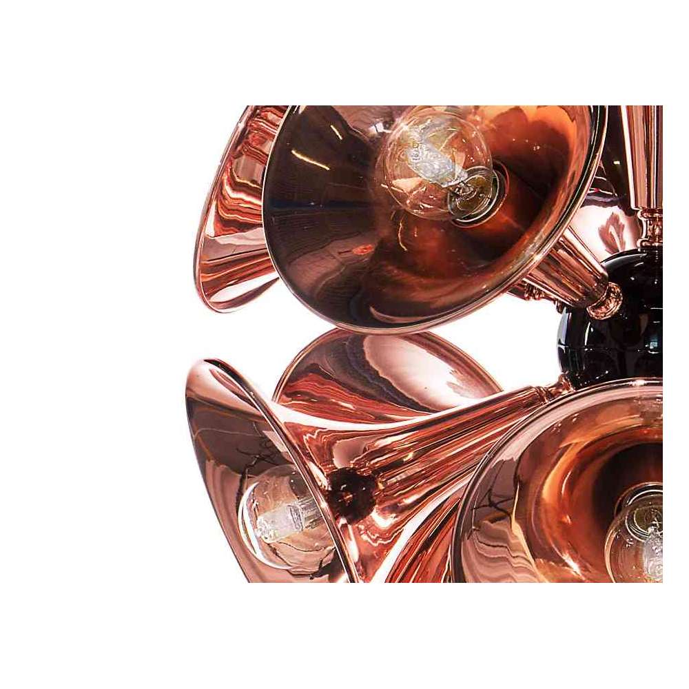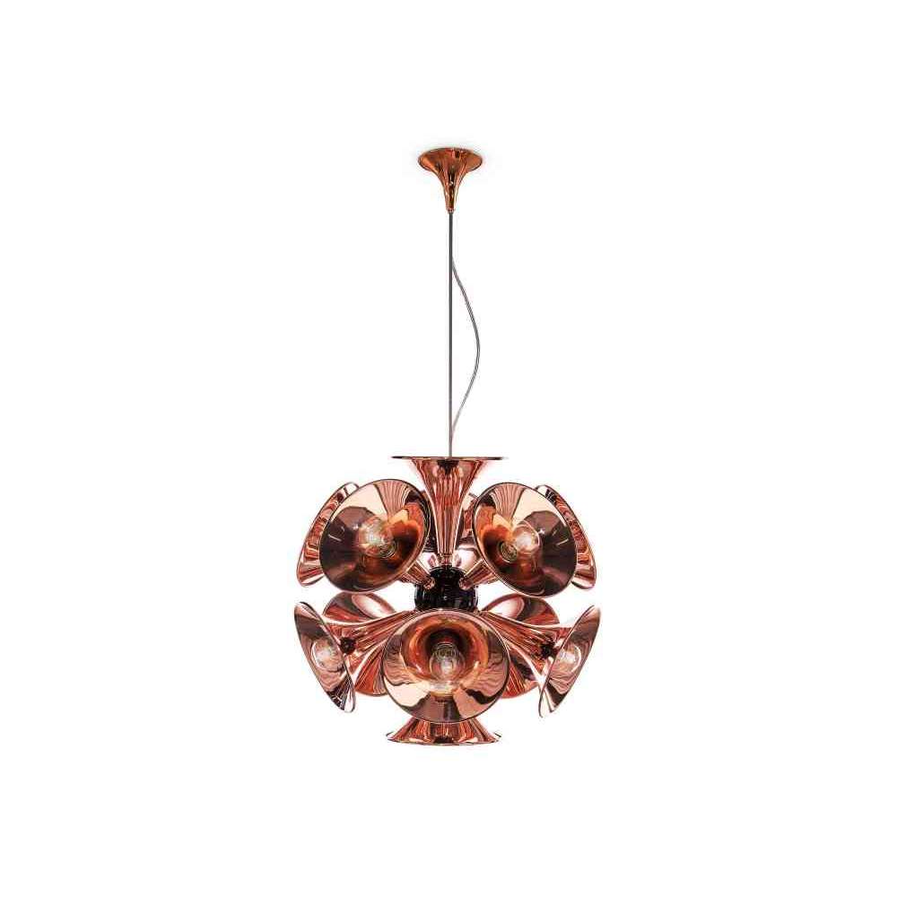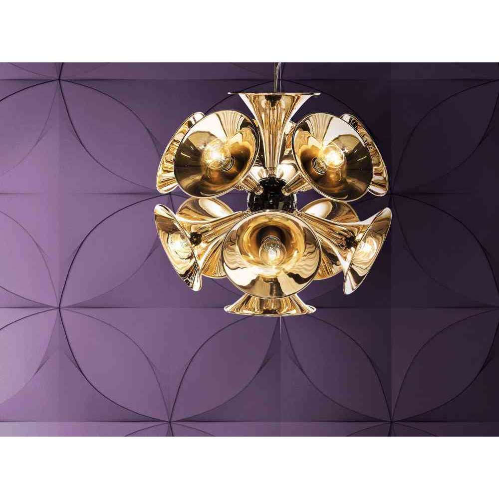 Zainspirowana amerykańskim trębaczem Chrisem Botti w hołdzie muzyce jazzowej, lampa wisząca Botti to nieco mniejsza wersja nowoczesnego żyrandola z 15 kształtami w kształcie trąbek, które rozciągają się od środka, tworząc idealną kulę . Wykonany jest ręcznie z mosiądzu, pokryty pozłacanym wykończeniem. Okrągła podstawa pośrodku zawieszonej lampy jest wykonana ręcznie z aluminium i polakierowana na błyszczącą czerń, ale można ją również polakierować na błyszczącą biel, aby zaspokoić potrzeby najbardziej wykwintnych zestawów. W stylu retro ta lampa wisząca w stylu art deco najlepiej nadaje się do salonu w stylu vintage lub nowoczesnej sypialni z połowy wieku.