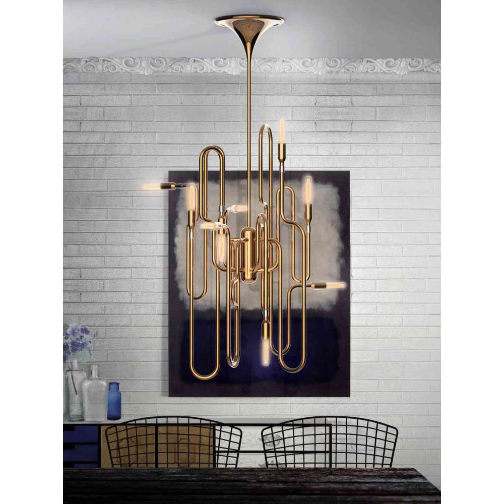 CLARK - Idealny wybór, aby nadać swojemu domowi delikatny i wyrafinowany akcent z rzeźbiarskim dramatem. Jej konstrukcja jest wykonana z mosiądzu, pokryta złotą wanną, podobnie jak prawdziwe trąbki. Ta lampa nadaje doskonały nastrój jadalni lub salonie. Pozwól sobie być częścią lampy wiszącej Clark, odważ się zmienić swój sposób patrzenia na oświetlenie w swoim domu. STANDARDOWE WYKOŃCZENIA: Rama: chromowana lub pozłacana. Szczegóły: chromowane lub pozłacane. WYMIARY: Wysokość: 27,5" | 70cm Średnica: 19,6" | Wysokość słupa 50 cm: możliwość dostosowania przy zakupie. LAMPY: Lampy E14 10x (w zestawie).