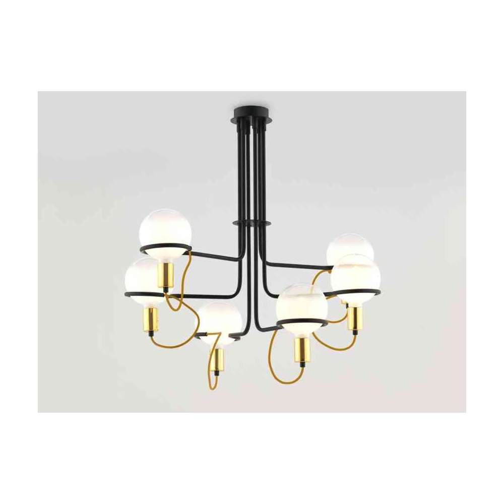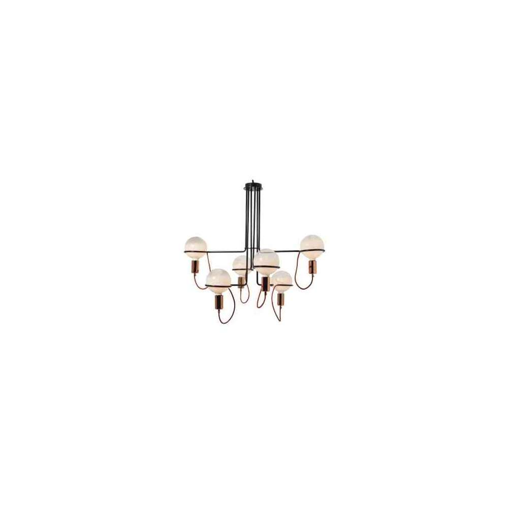 Sześciopunktowa lampa wisząca. Wykończenie z matowego mosiądzu lub miedzi. Klosze ze szkła opalowego. W komplecie oprawki E-27 z żarówkami LED o mocy 5W.