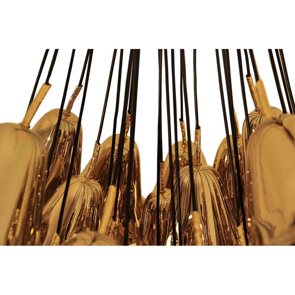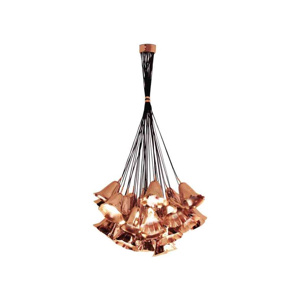 Wyobraź sobie bukiet delikatnych kwiatów lilii zdobiący Twój sufit, uwieczniony w lśniącym metalicznym odcieniu. Żyrandol Gia składa się z ręcznie rzeźbionych metalowych lilii calla swobodnie zawieszonych na grupie sznurków.