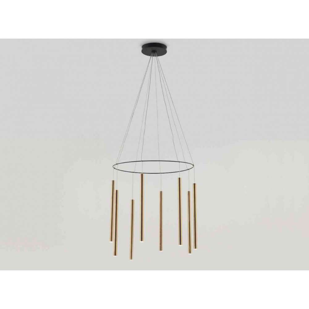 Metalowa zawieszka w kolorze miedzi lub grafitu. Baldachim i metalowy pierścień w czarnym wykończeniu. 8 zintegrowanych i niewymiennych ciepłych diod LED o mocy 1W.