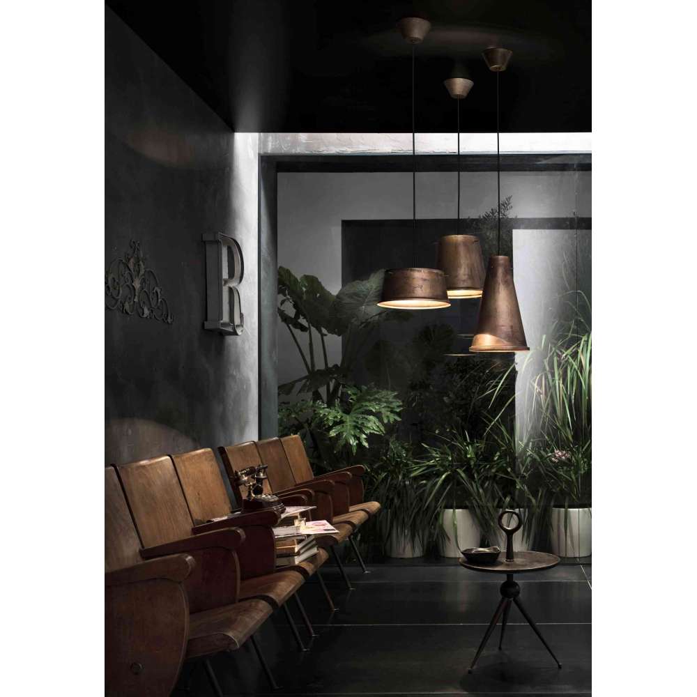 Proste i liniowe kształty inspirują funkcjonalny projekt . Oto Khonus: seria stożkowych lamp wykonanych z antycznego żelaza, zdolnych do odbijania światła zarówno w dół, jak i w górę, całkowicie oświetlając otoczenie. Dostępne w trzech różnych rozmiarach, mogą być aranżowane pojedynczo lub razem podkreślając ich istotę.