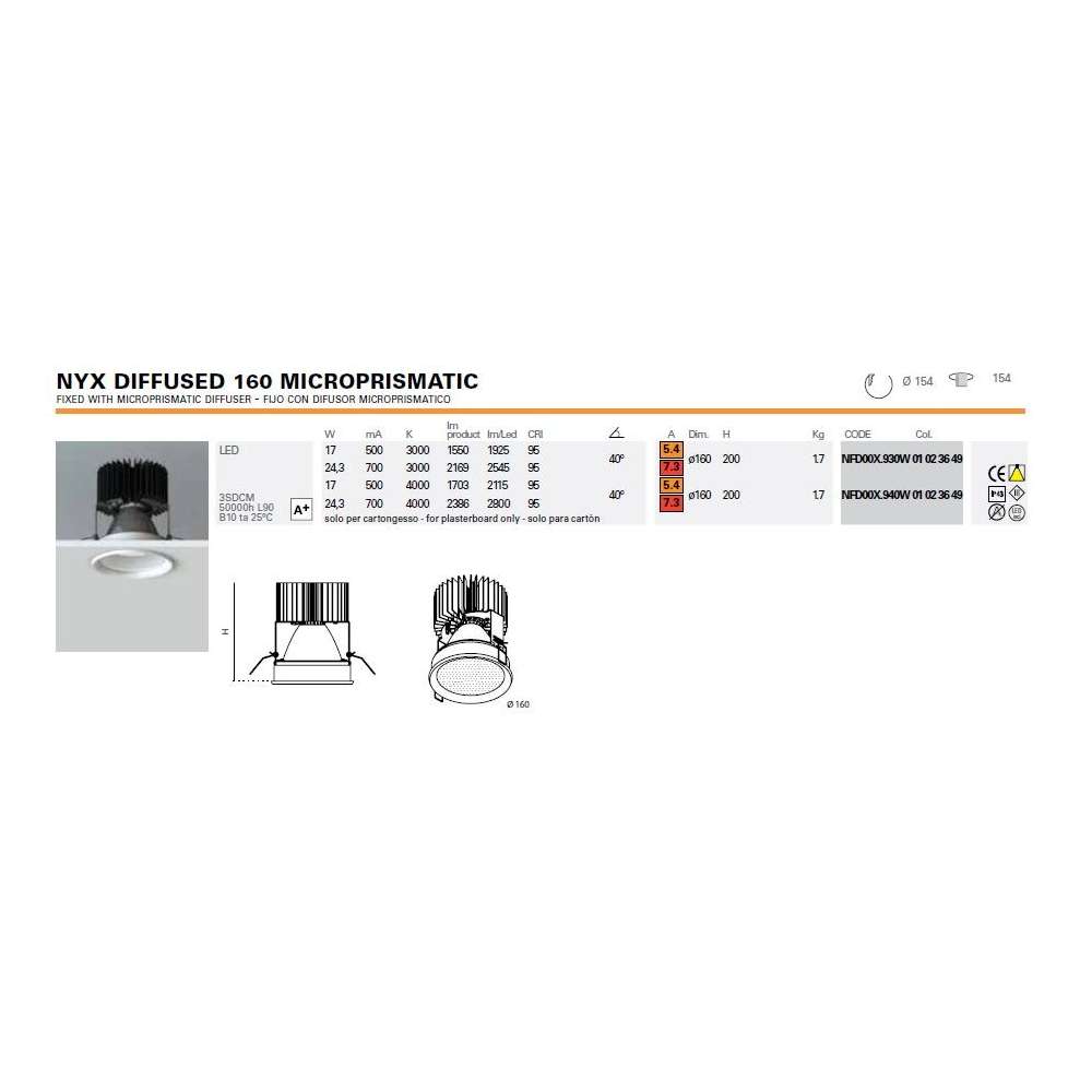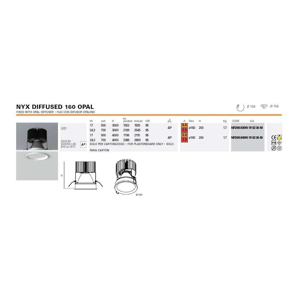Downlight do wbudowania do montażu w suficie podwieszanym, do oświetlenia rozproszonego. W komplecie z mlecznym kloszem z poliwęglanu lub mikropryzmatycznym kloszem o niskiej luminancji. Zintegrowane źródło LED Chip On Board. Korpus i układ optyczny z malowanego aluminium. Odbłyśnik z powłoką z czystego aluminium 99,99%. Stopień ochrony zdalnego zasilacza IP43. NYX to gama opraw wpuszczanych, stałych i kierunkowych, dostarczanych w wersji do wbudowania, z profil wytłaczany w oryginalnej formie TUBE, z wyjmowanym cylindrem, co umożliwia wybór pomiędzy różnymi konfiguracjami estetycznymi. Asortyment jest dostępny w kształtach kwadratowych i okrągłych, z szerokim wyborem rozmiarów. Produkty przeznaczone są do zintegrowanych gniazd LED i halogenowych do źródeł LED i halogenowych.Odbiorca: :