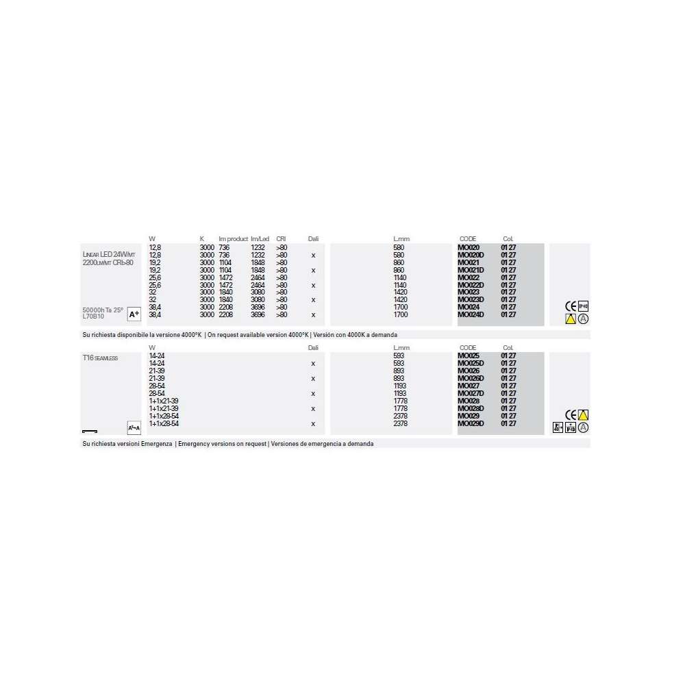 Seria opraw półwpuszczanych, nastropowych lub zwieszanych do bezpośredniego oświetlenia rozproszonego. Do liniowych źródeł LED lub świetlówek bezszwowych T16. Zintegrowane zasilanie elektroniczne 230/240V 50/60Hz. Dostępne zarówno jako moduły domyślne, jak i moduły do montażu w systemie. Korpus z ekstrudowanego aluminium, lakierowany lub anodowany. Klosz z poliwęglanu w kolorze opalizującym oraz zaślepki boczne systemu Light Proof. Stopień ochrony IP40 lub IP43 w zależności od sposobu montażu.Odbiorca: :