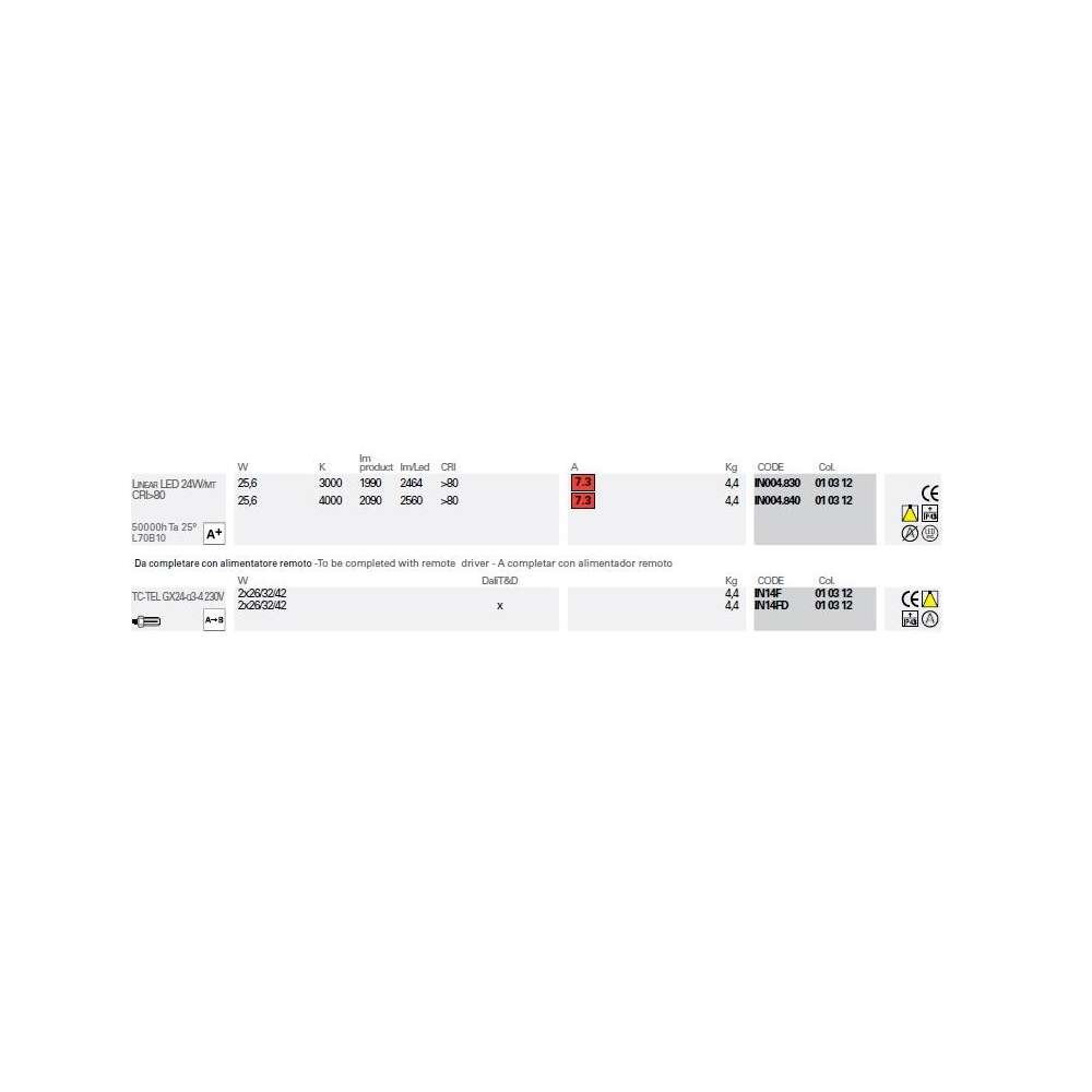 Downlight do wbudowania tylko do montażu na suficie, do oświetlenia rozproszonego, w komplecie z liniowymi źródłami LED 220V lub do świetlówek kompaktowych TC-TEL GX24 q3/-4. W komplecie z mlecznym białym dyfuzorem z PMMA i statecznikiem elektronicznym 50/60Hz 230/240V. Korpus i supercienka rama o szerokości 18 mm z malowanego lub chromowanego metalu. Można go uzupełnić malowaną metalową skrzynką do montażu na suficie. Można go również montować w ścianach betonowych lub ceglanych za pomocą specjalnej skrzynki ściennej ze stali ocynkowanej, dostępnej jako akcesorium. Stopień ochrony IP43.Odbiorca: :