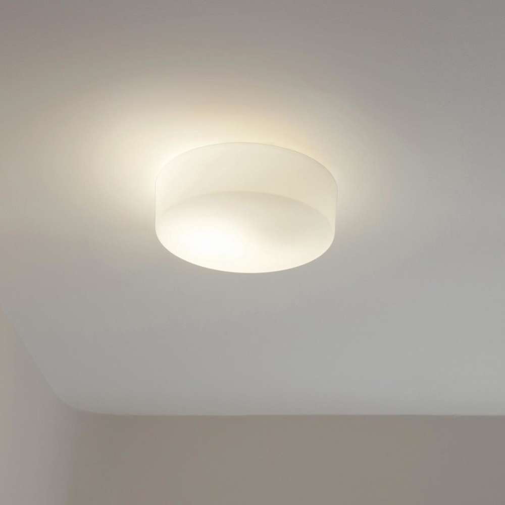 Lampa ścienna i sufitowa, z dyfuzorem z opalizowanego szkła dmuchanego i podstawą z białego metalu pokrytego żywicą epoksydową.