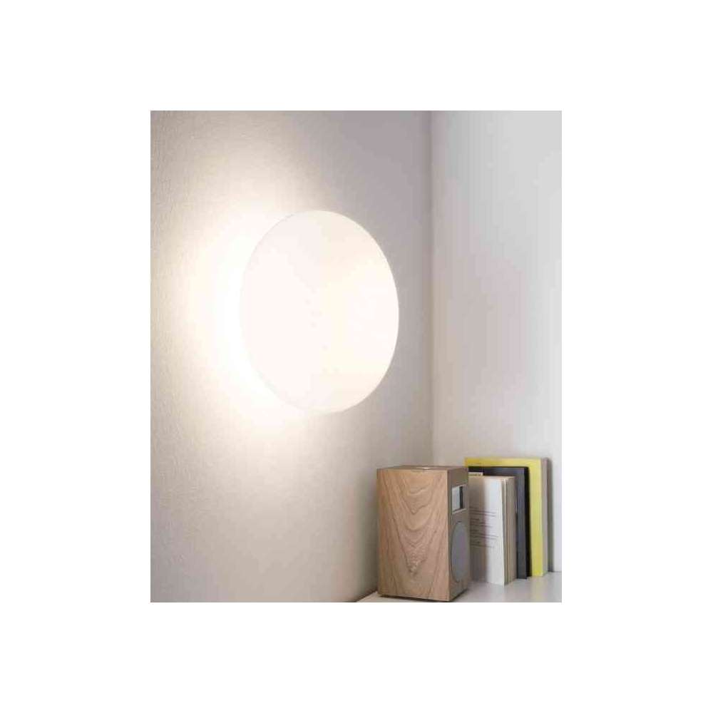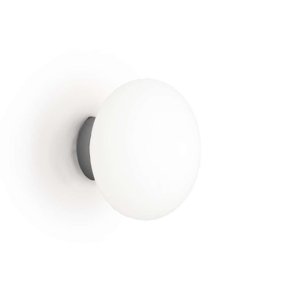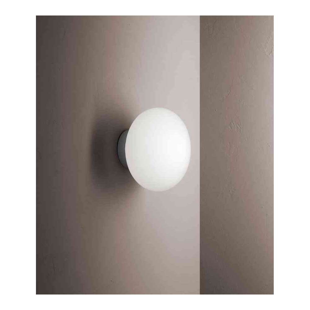 Maga to lampa ścienna/sufitowa z dyfuzorem z opalowego dmuchanego szkła. Sprężynowe przezroczyste plastikowe mocowanie lub chromowane mocowanie do ściany.
