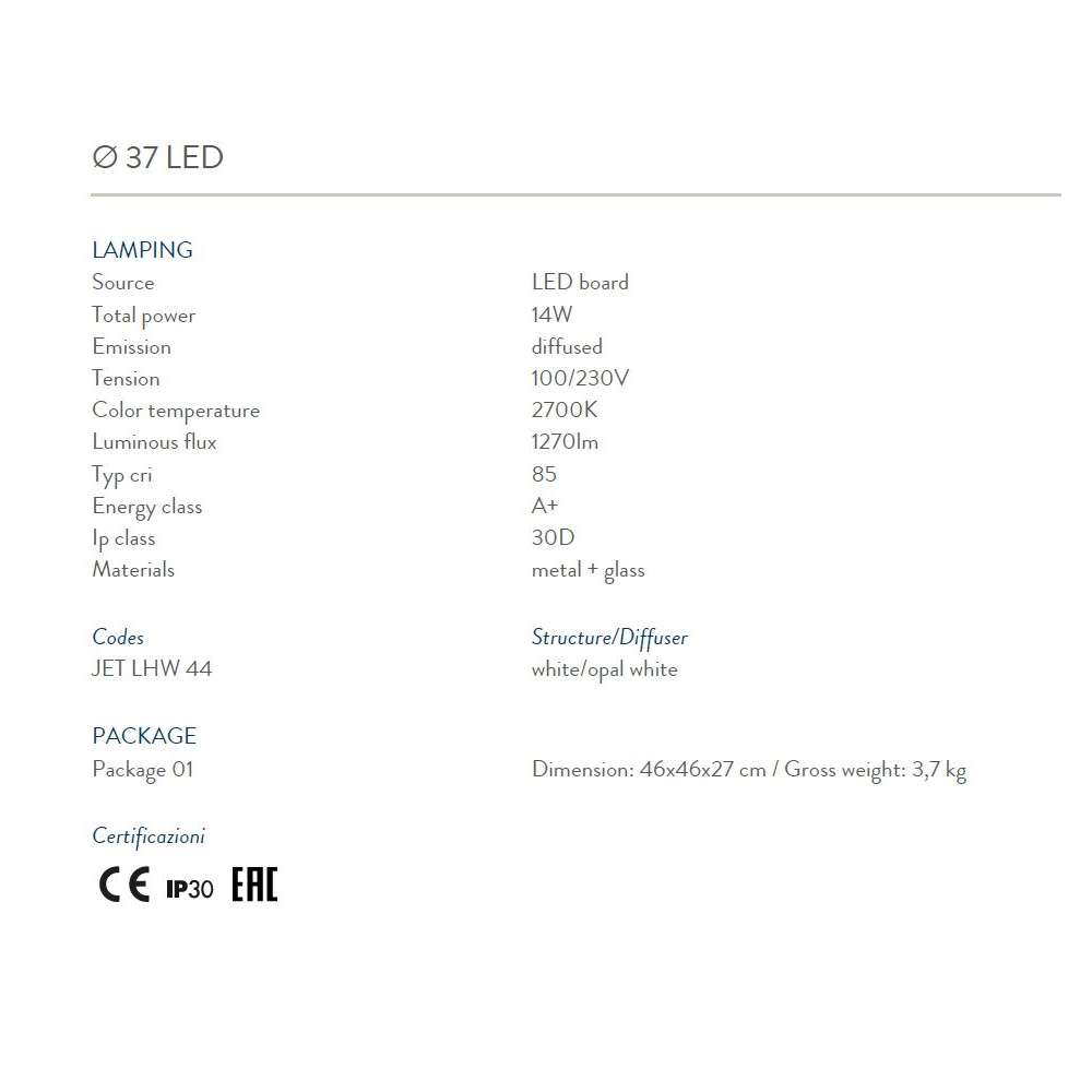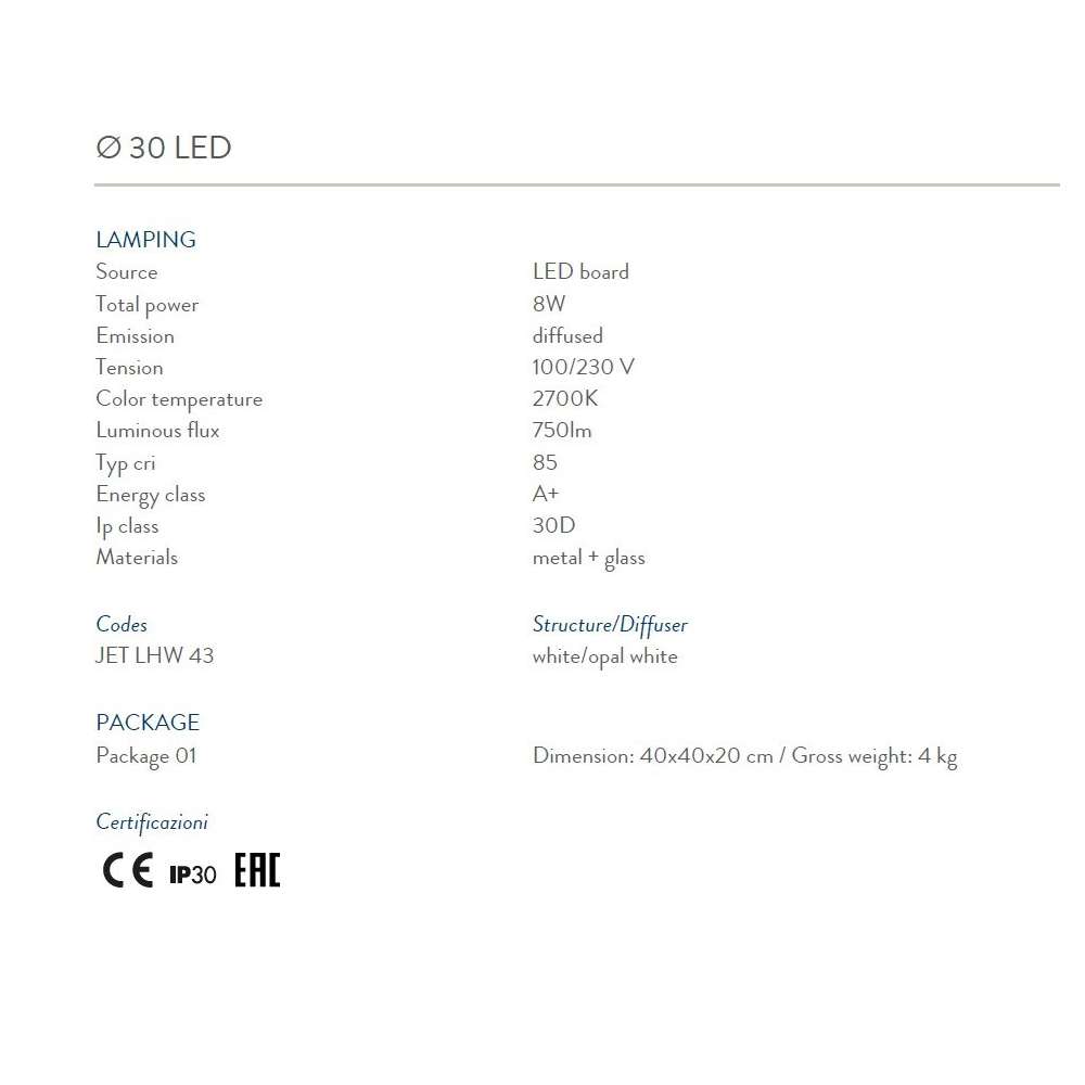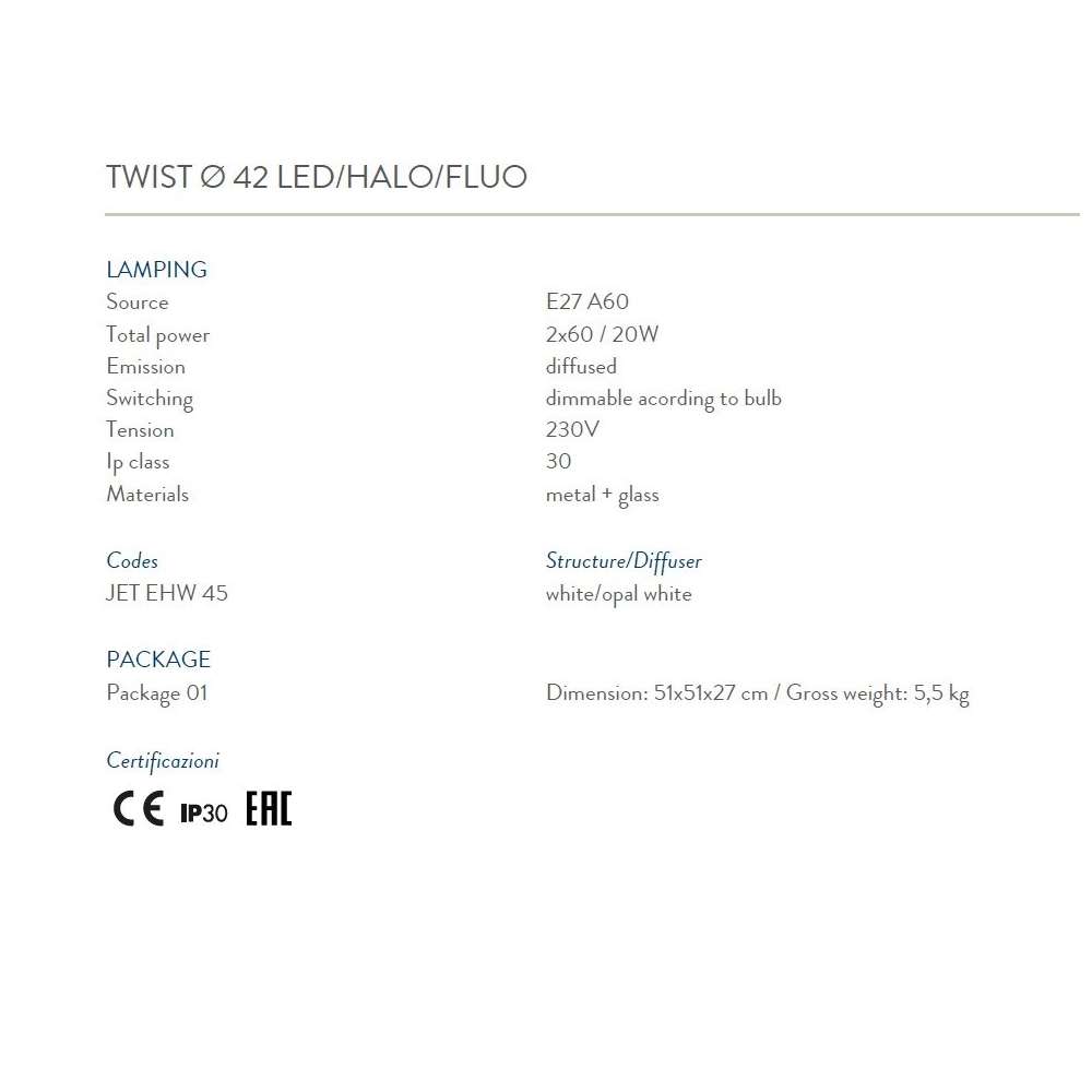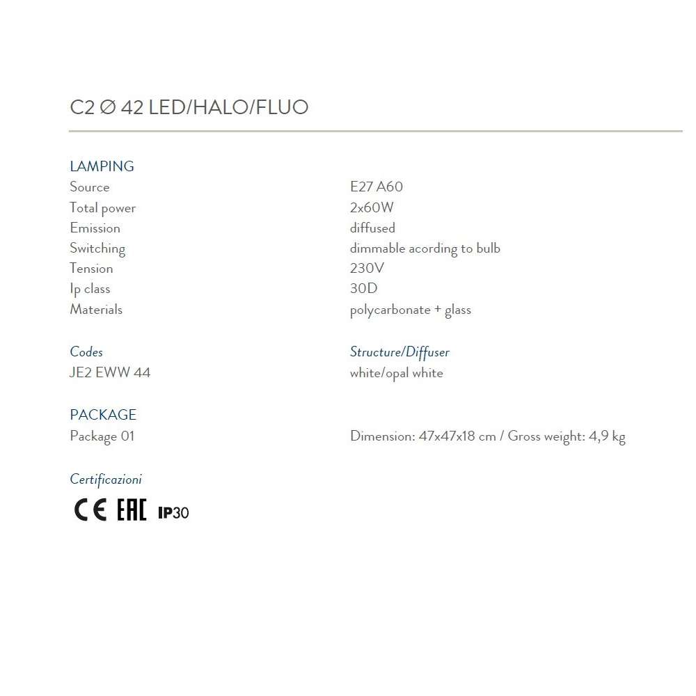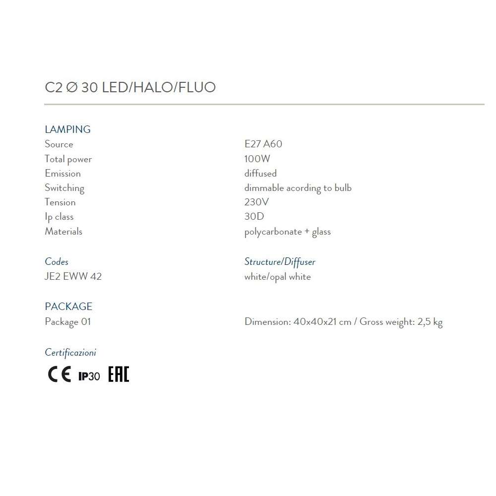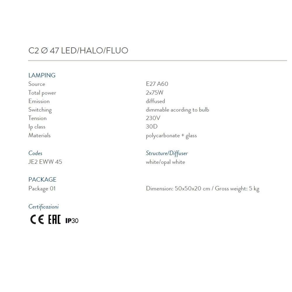 Lampa ścienna i sufitowa, z mlecznym kloszem z dmuchanego szkła. Szkło obraca się i blokuje. Podstawa z białego metalu pokrytego żywicą epoksydową z chromowanym pierścieniem (Jesolo Twis/Plus) lub z białego poliwęglanu (Jesolo C2). Wersja LED dostępna dla średnicy 30/37cm. WERSJE: - 30 LED - Ø 37 LED - C2 Ø 30 LED/HALO/FLUO - C2 Ø 37 LED/HALO /FLUO - C2 42 LED/HALO/FLUO - C2 Ø 47 LED/HALO/FLUO - TWIST Ø 25 LED/HALO/FLUO - TWIST Ø 30 LED/HALO/FLUO - TWIST Ø 37 LED/HALO/FLUO - TWIST Ø 42 LED/HALO/FLUO - TWIST Ø 47 LED/HALO/FLUO 2X75/20W - TWIST Ø 47 LED/HALO/ FLUO 3X60/20WOdbiorca: :