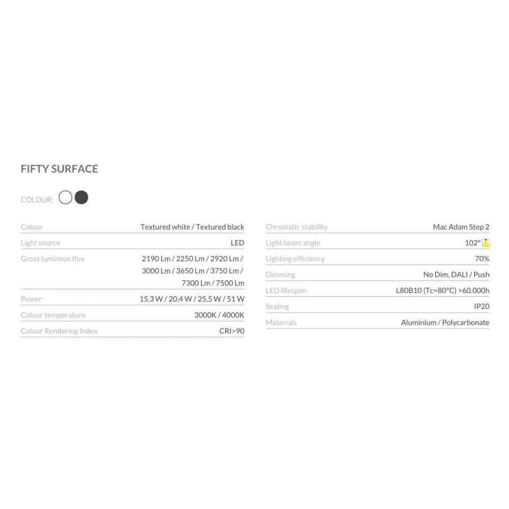 Fifty Surface, to profil LED do zastosowań powierzchniowych, idealny do oświetlenia podłużnego, gdzie jego dyfuzor przyczynia się do oświetlenia w sposób funkcjonalny. Ogólnie rzecz biorąc, profil ten jest w stanie podjąć się zadania podkreślenia różnych linii, brył czy pasów, które są określone w architekturze przestrzeni.