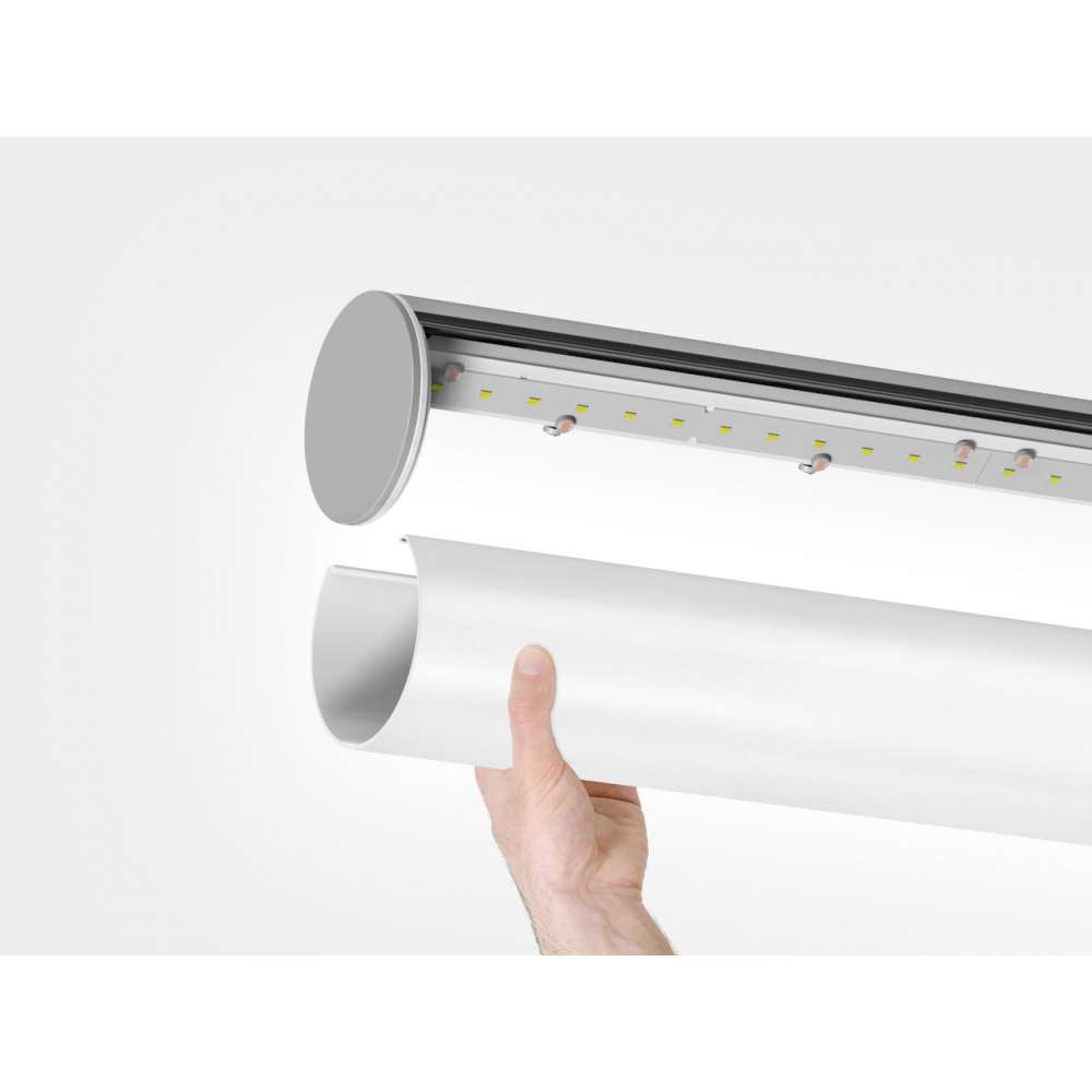 Rurowa oprawa LED do montażu nastropowego lub zwieszanego, do ciągów świetlnych. Korpus o średnicy Ø100mm, złożony z wytłaczanego profilu aluminiowego, anodowanego w kolorze naturalnym i opalizującego poliwęglanowego klosza wpinanego bLINE oraz nasadek z wtryskiwanego poliwęglanu, dostępny w kolorze szarym, białym i czarnym. Rozeta sufitowa dostępna w wersji wpuszczanej i natynkowej. Ciągła linia jest możliwa dzięki zastosowaniu unikalnego systemu, z zestawem szybkich złączy korpusu, bez konieczności stosowania śrub lub użycia jakichkolwiek narzędzi, zarówno w przypadku części mechanicznej, jak i elektrycznej. Wersja standardowa w 4000K LED, CRI>80 i 60.000h żywotności (@L90, B10, Ta 25ºC). Dostępna wersja ściemnialna DALI. Opcjonalna jednostka awaryjna 3000K i 1h lub 3h. Dostępna opcja wysokiej mocy (HO).