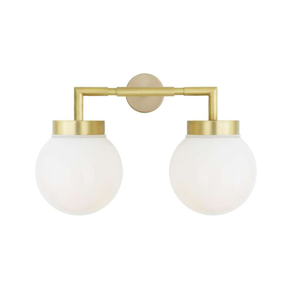 JORDAN DOUBLE to kinkiet z dwoma szklanymi kloszami o średnicy 15 cm. Szklane klosze lamp mogą być w kolorze przezroczystym lub opalowym. Mosiężna tuleja wystaje prostopadle ze wspornika ściennego JORDAN DOUBLE przed połączeniem kolejnej poziomej mosiężnej tulei równoległej do ściany. Stąd dwie szczelne mosiężne galerie są przymocowane pod kątem prostym do poziomego rękawa. Mosiężne galerie bezpiecznie i pewnie utrzymują obydwa szklane abażury na miejscu. Kinkiet JORDAN DOUBLE można zamontować tak, aby klosze kuliste były skierowane w dół do podłogi lub w górę do sufitu, w zależności od kierunku, w którym ma padać większość światła.
