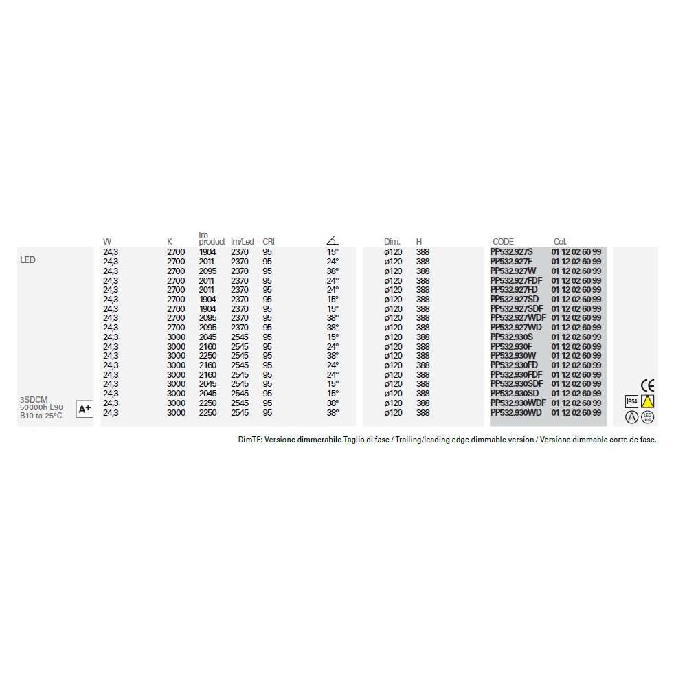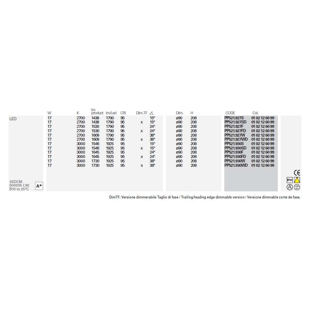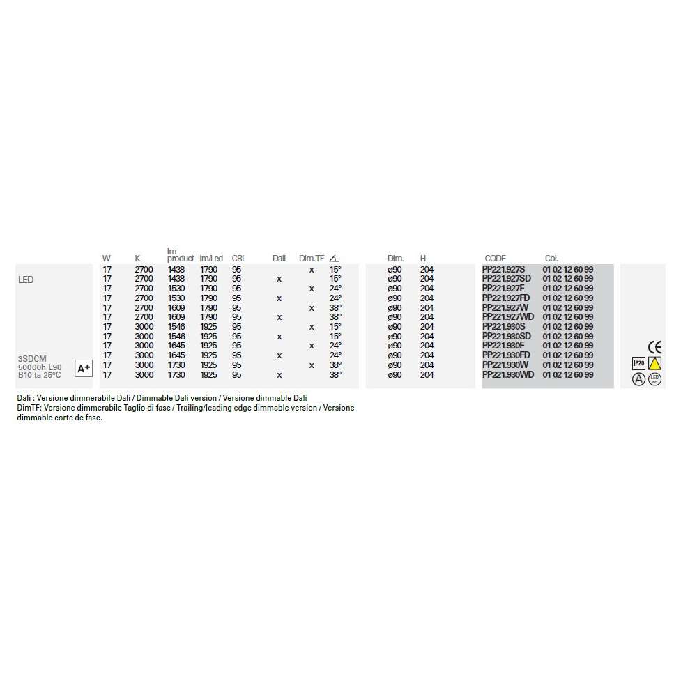 Oprawy montowane do sufitu, naścienne lub wiszące do stałego lub regulowanego oświetlenia bezpośredniego. W komplecie z profesjonalnym źródłem LED lub do lamp led/halogen 12V/230V GU5,3 QR-CB51 i 230V GU10 QPAR16. W komplecie ze skrzynką sterującą. Cylindryczny korpus z malowanego wytłaczanego aluminium. W komplecie ze wspornikiem do montażu sufitowego, przewodem zasilającym L.2000 mm i stalowymi linkami do zawieszania z mikrometrycznym systemem regulacji lub wspornikiem do mocowania na ścianie, w zależności od modelu. Stopień ochrony IP20/IP54.Odbiorca: :