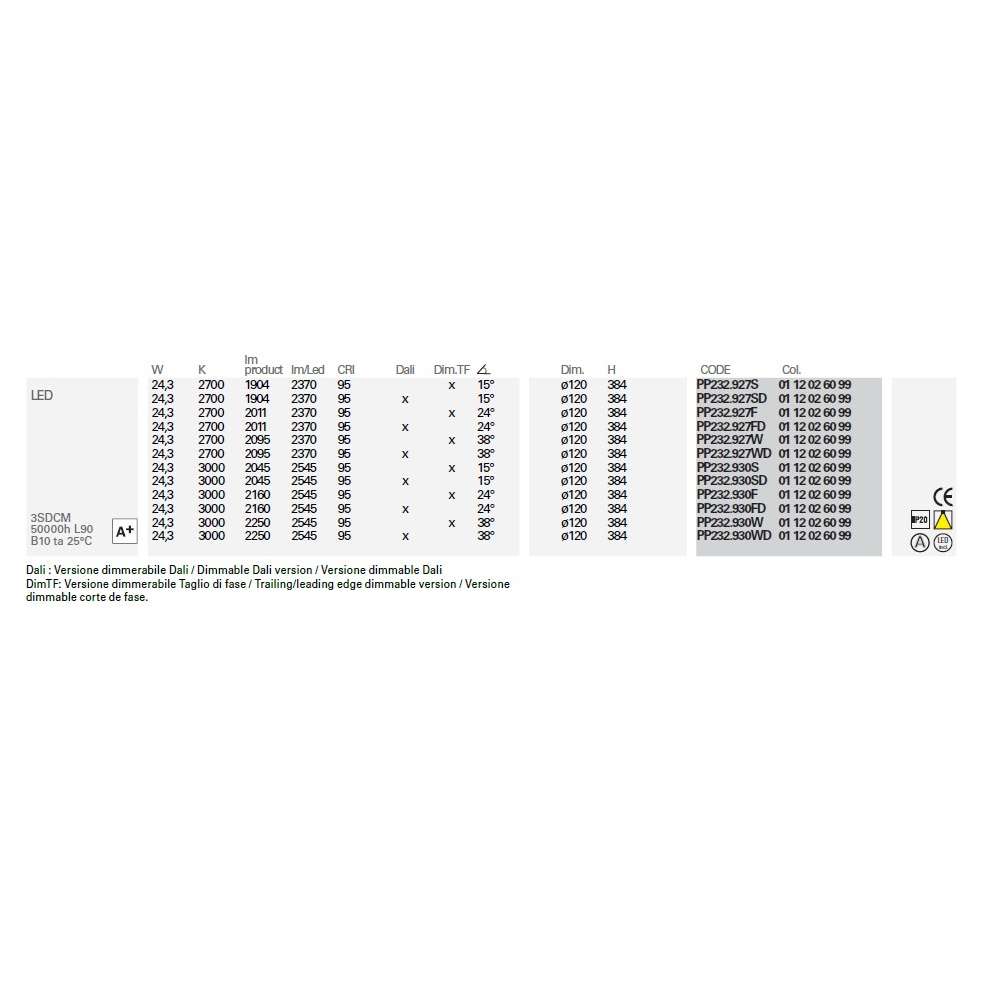 Oprawy montowane do sufitu, naścienne lub wiszące do stałego lub regulowanego oświetlenia bezpośredniego. W komplecie z profesjonalnym źródłem LED lub do lamp led/halogen 12V/230V GU5,3 QR-CB51 i 230V GU10 QPAR16. W komplecie ze skrzynką sterującą. Cylindryczny korpus z malowanego wytłaczanego aluminium. W komplecie ze wspornikiem do montażu na suficie, przewodem zasilającym L.2000 mm i stalowymi linkami do zawieszania z mikrometrycznym systemem regulacji lub wspornikiem do montażu na ścianie, w zależności od modelu. Stopień ochrony IP20/IP54.