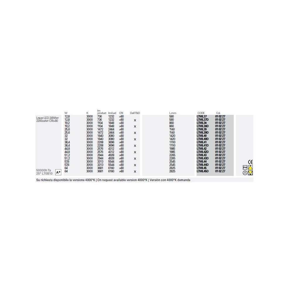 Seria opraw do wbudowania i bez przycięcia wpuszczanych, montowanych na suficie/ścianie i wiszących do oświetlenia bezpośredniego, rozproszonego i/lub akcentującego. Do zintegrowanych liniowych źródeł LED, świetlówek bezszwowych T16 i zintegrowanych reflektorów LED. Zintegrowane zasilanie elektroniczne 230/240V 50/60Hz. Korpus o wymiarach 62x32 mm. wytłaczane aluminium. Malowane lub anodowane wykończenie. Super smukły 5 mm. szerokość krawędzi wykończenia. W komplecie ze wspornikami mocującymi do sufitu podwieszanego/ściany, wyposażonym w system śrub mikroregulacyjnych i boczne zaślepki końcowe. Modele ze zintegrowanymi liniowymi źródłami LED i świetlówkami w komplecie z mlecznobiałym kloszem z poliwęglanu, wersje ze zintegrowanym reflektorem LED w komplecie z kilkoma aluminiowymi kształtownikami do szybkiego montażu. Stopień ochrony IP20/IP23 lub IP40/IP43 w zależności od wybranego modelu. Skrzynka ścienna z wytłaczanego aluminium do montażu wpuszczanego w ścianach betonowych lub ceglanych, dostępna jako wyposażenie dodatkowe.