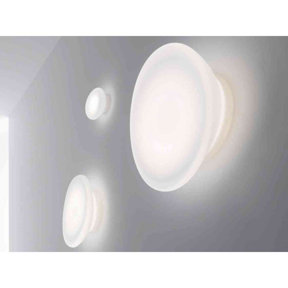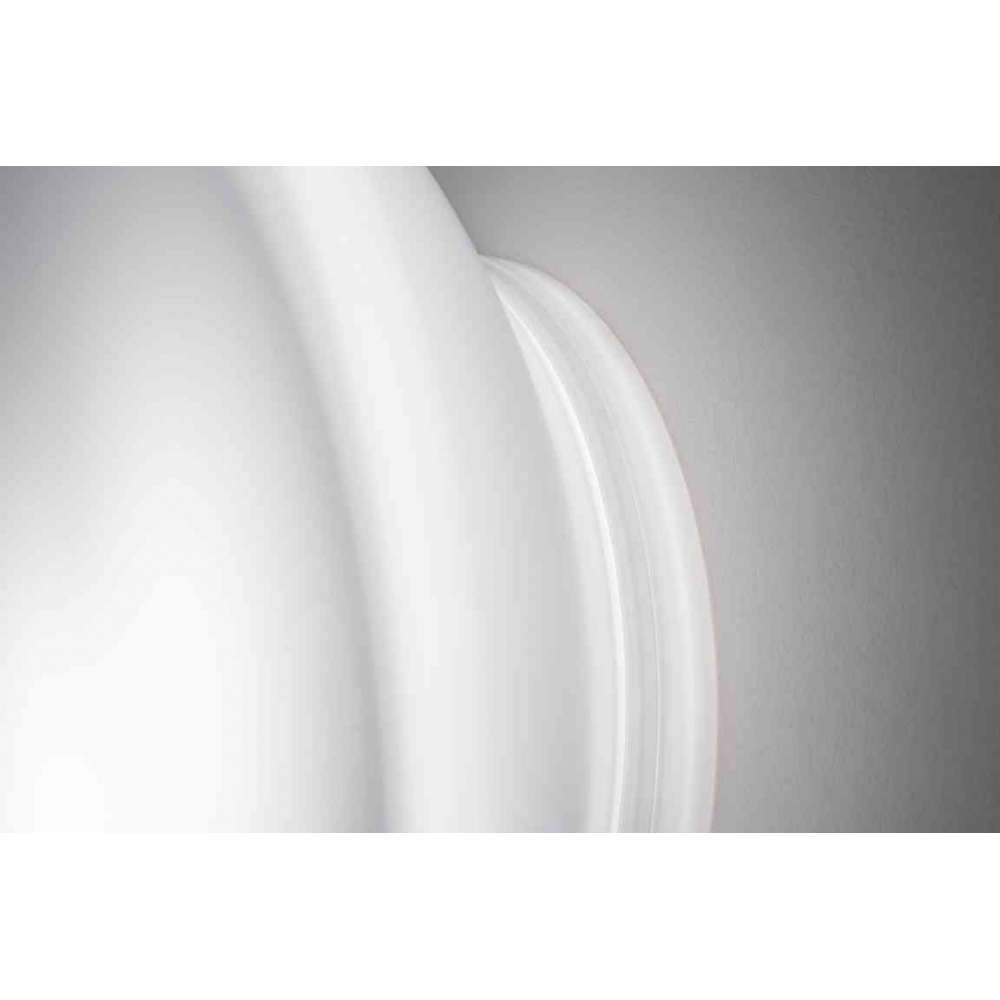 Dynamic to kinkiet z kloszem z mlecznego szkła Murano duplex uzyskiwanego poprzez dmuchanie na nieruchomą formę. Uchwyt ścienny/sufitowy z białego poliwęglanu. Źródło światła TopLED.