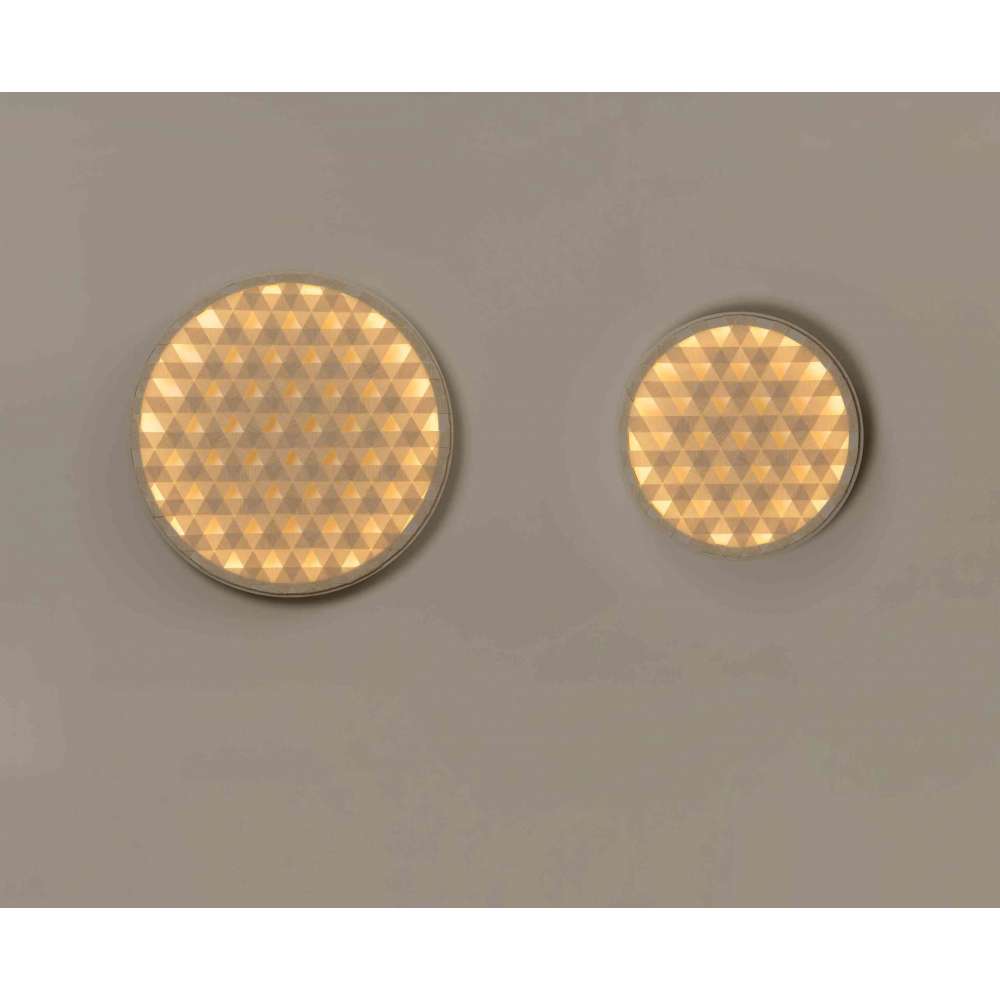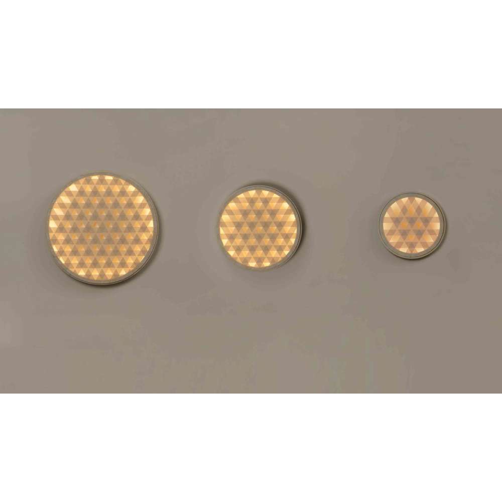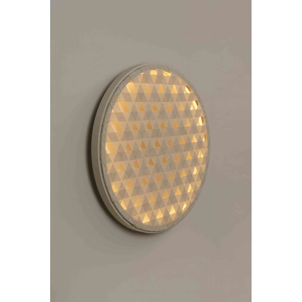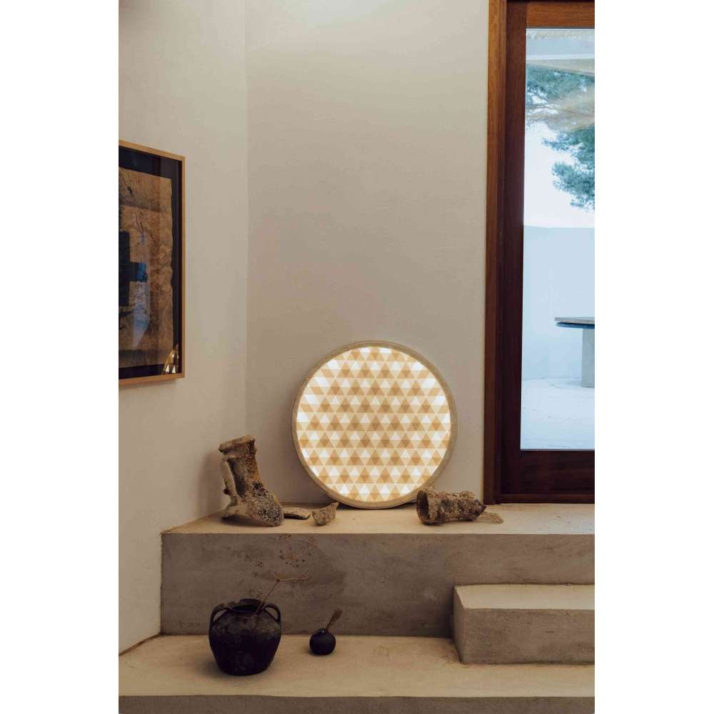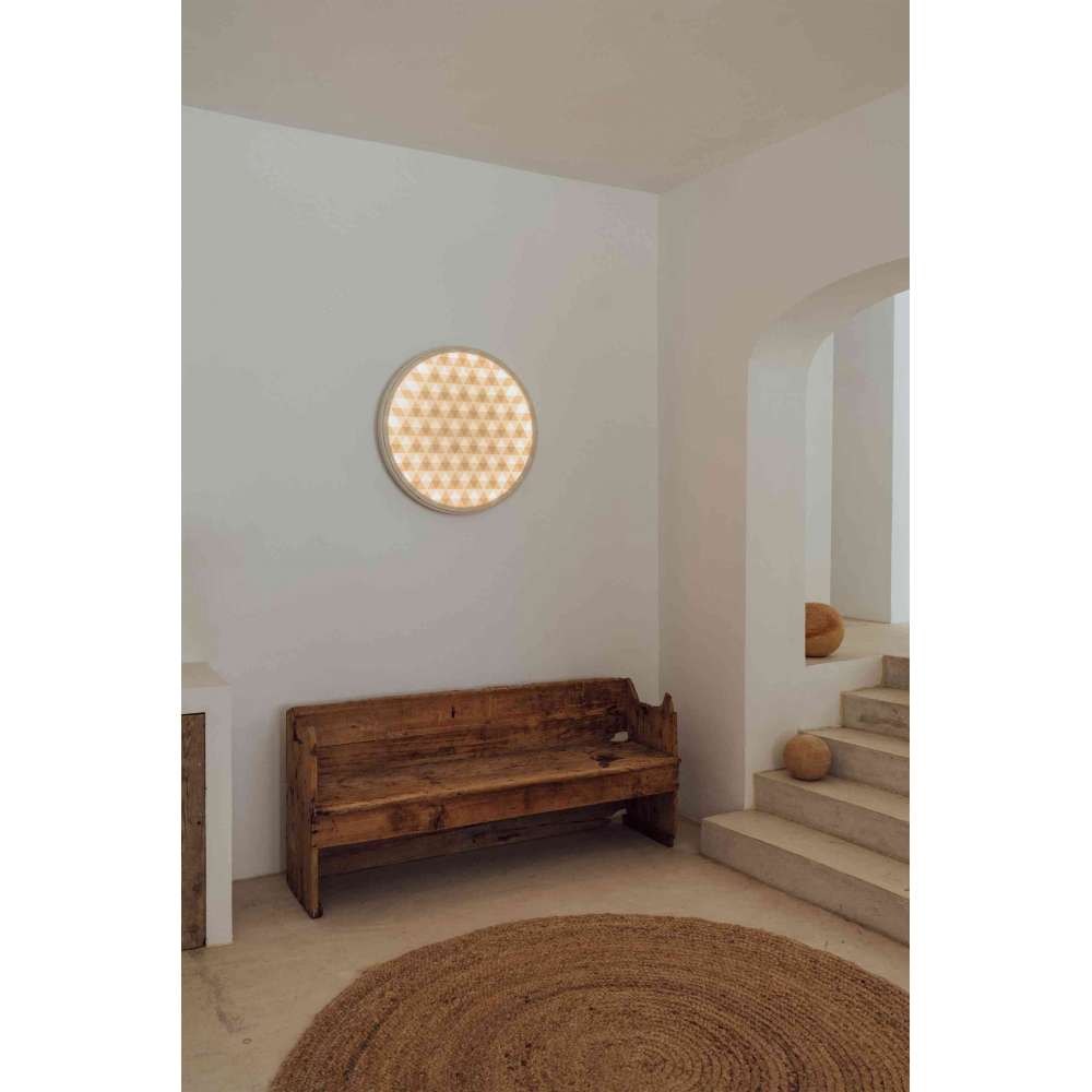 Loom to kinkiet. Ta ramka tworzy aureolę światła, która wyłania się z jej półprzezroczystej taśmy, tworząc grę światłocienia. W tej serii dostępne są trzy rozmiary ręcznie klejonych kinkietów, co pozwala na tworzenie wielu różnych kompozycji, ponieważ można je łączyć na tej samej powierzchni, aby zapewnić zarówno światło, jak i sztukę. Powtórzenie wzoru splotu równobocznego wnosi do atmosfery spokój i spokój.