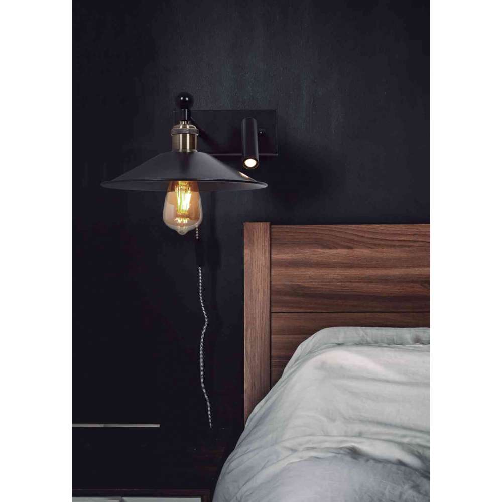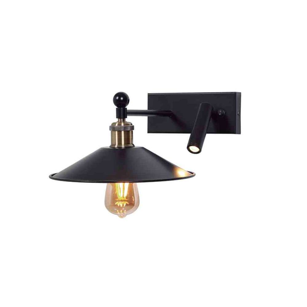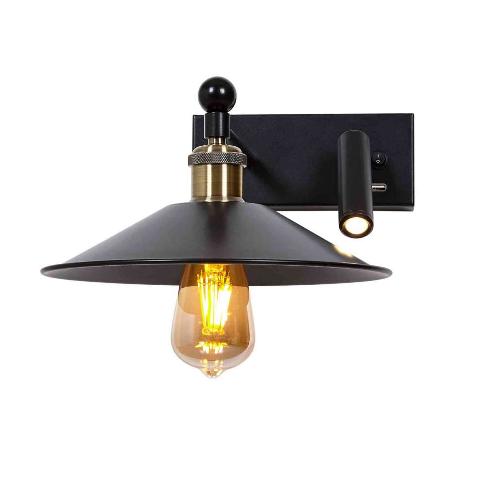 Kinkiet w czarnej strukturze z czarnym metalicznym kloszem (1 x E-27 vintage, brak w zestawie), średnica klosza 25cm, wspornik ścienny 16 x 7 cm, głębokość 17 cm, w zestawie led 3W150 lm 3.000 K z włącznikiem/wyłącznikiem, czytnik led 10,5 cm i średnica 2,8 cm, IP20